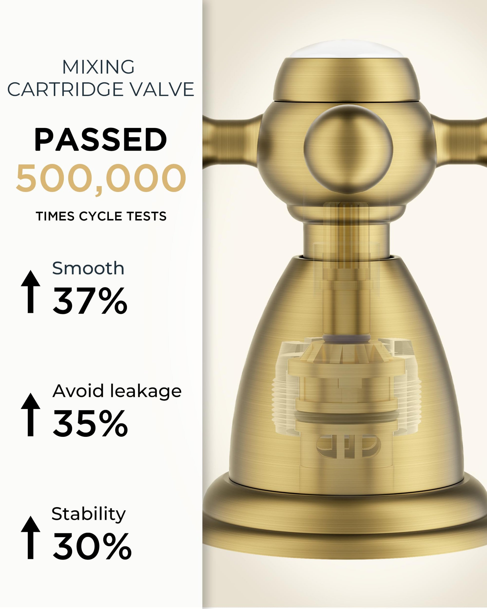 - CERANIC VALVE CORE-All cartridge valve of forious gold bathroom faucet has passed 500,000 cycles of water tightness test, to ensure high air tightness and stable, which is unaffected by temperature extremes, sand, rust, and hard water conditions