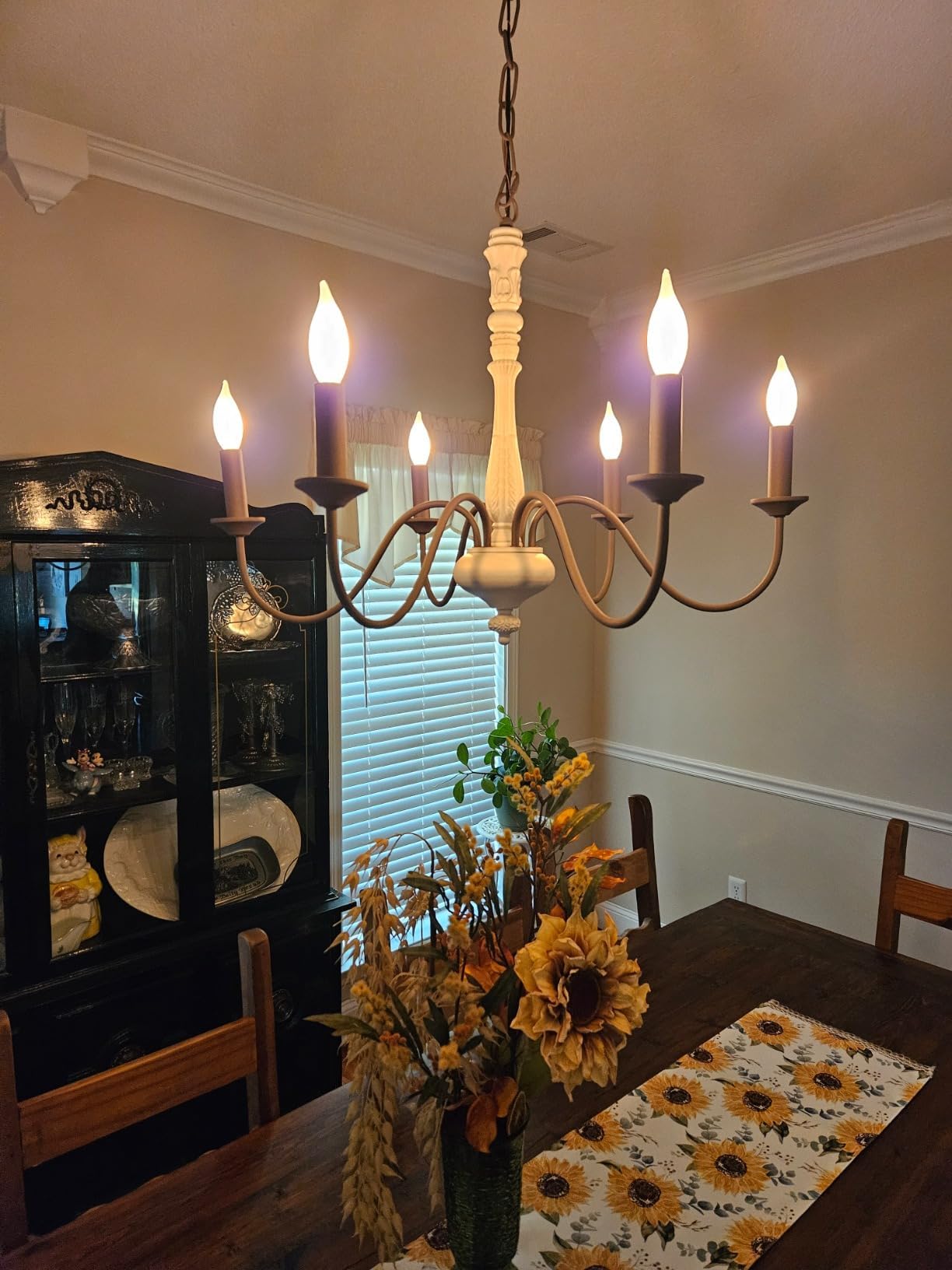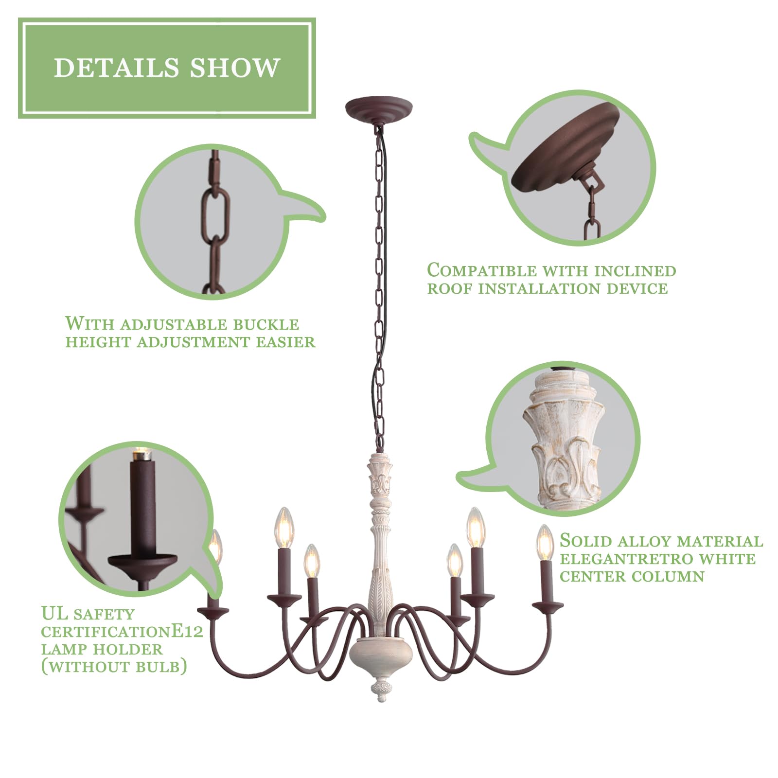 - 【ELEGANT FARMHOUSE CHANDELIER】 This candle chandelier style farmhouse chandelier is full of personality. The old white zinc alloy column and modern dark brown elbow arm present a unique modern retro style. It is widely used in farmhouse, industry, retro and modern spaces.