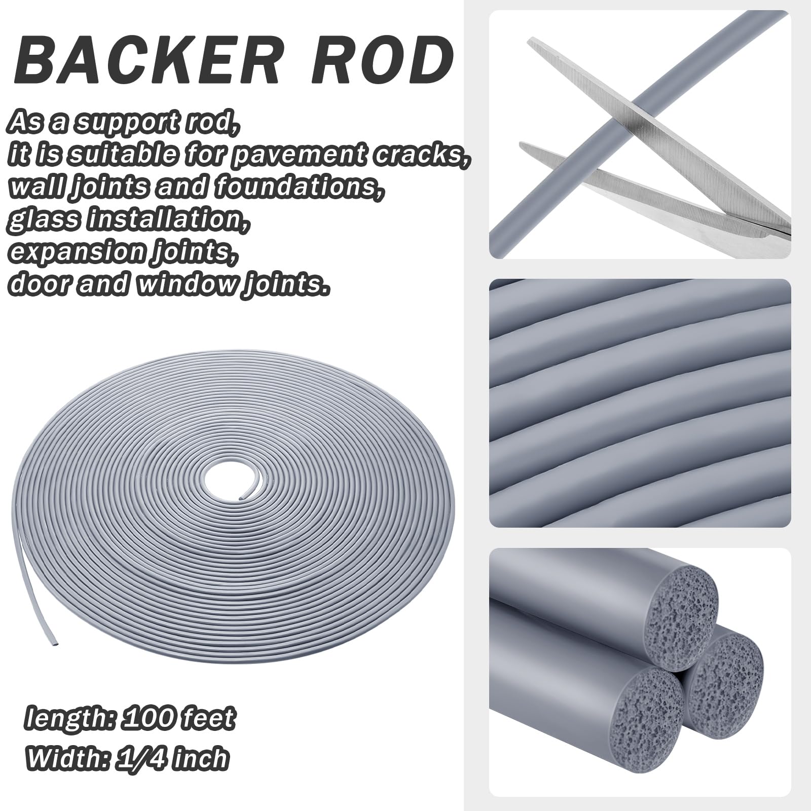 - Long Enough: you will receive 1 roll of backer rod 1/4 inch for door frame measuring about 1/4 inch x 100 feet, which can be easily trimmed to a suitable size with scissors (not included) according to your actual needs, enough length to meet your daily needs and replacement