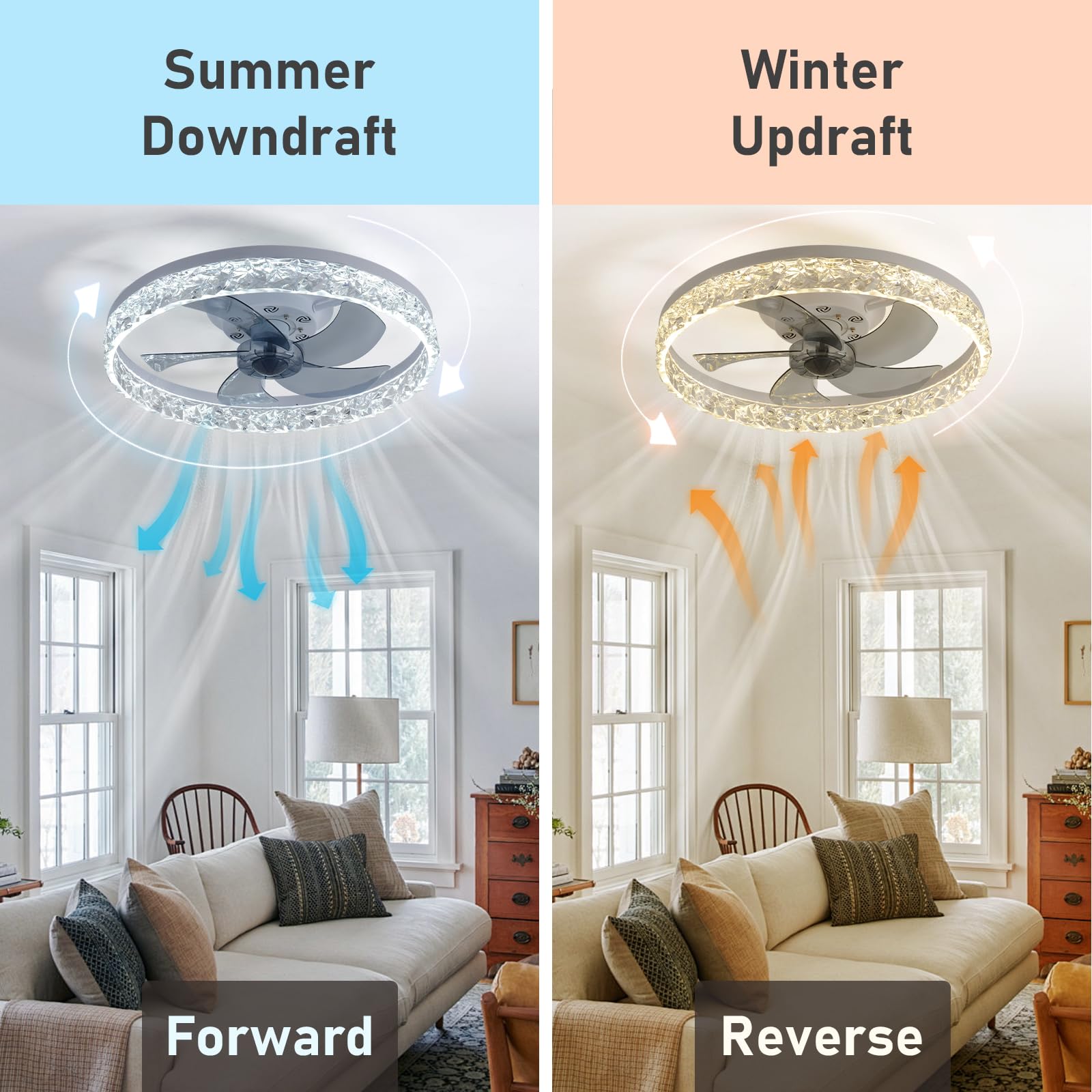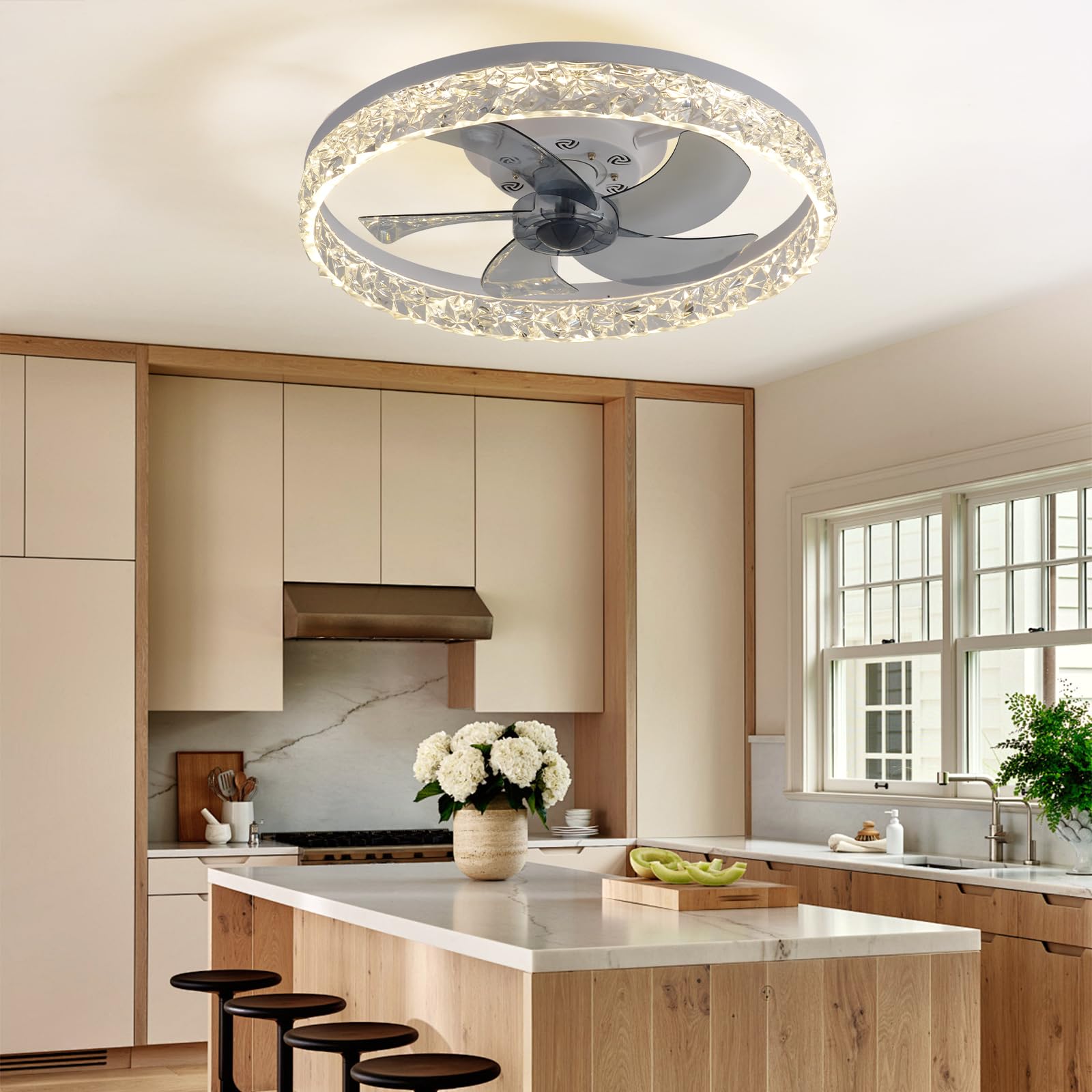 FRIXCHUR 19.7" Crystal Chandelier Fan Modern Flush Mount Ceiling Fan with Lights Dimmable Low Profile Ceiling Fans 6 Speeds 3 Color Fandeliers for Bedroom Living Room Kitchen (White)