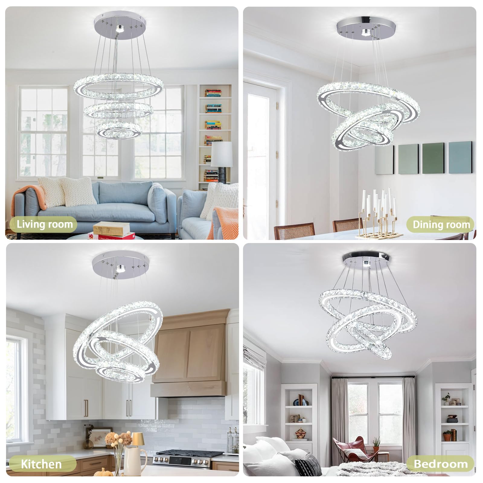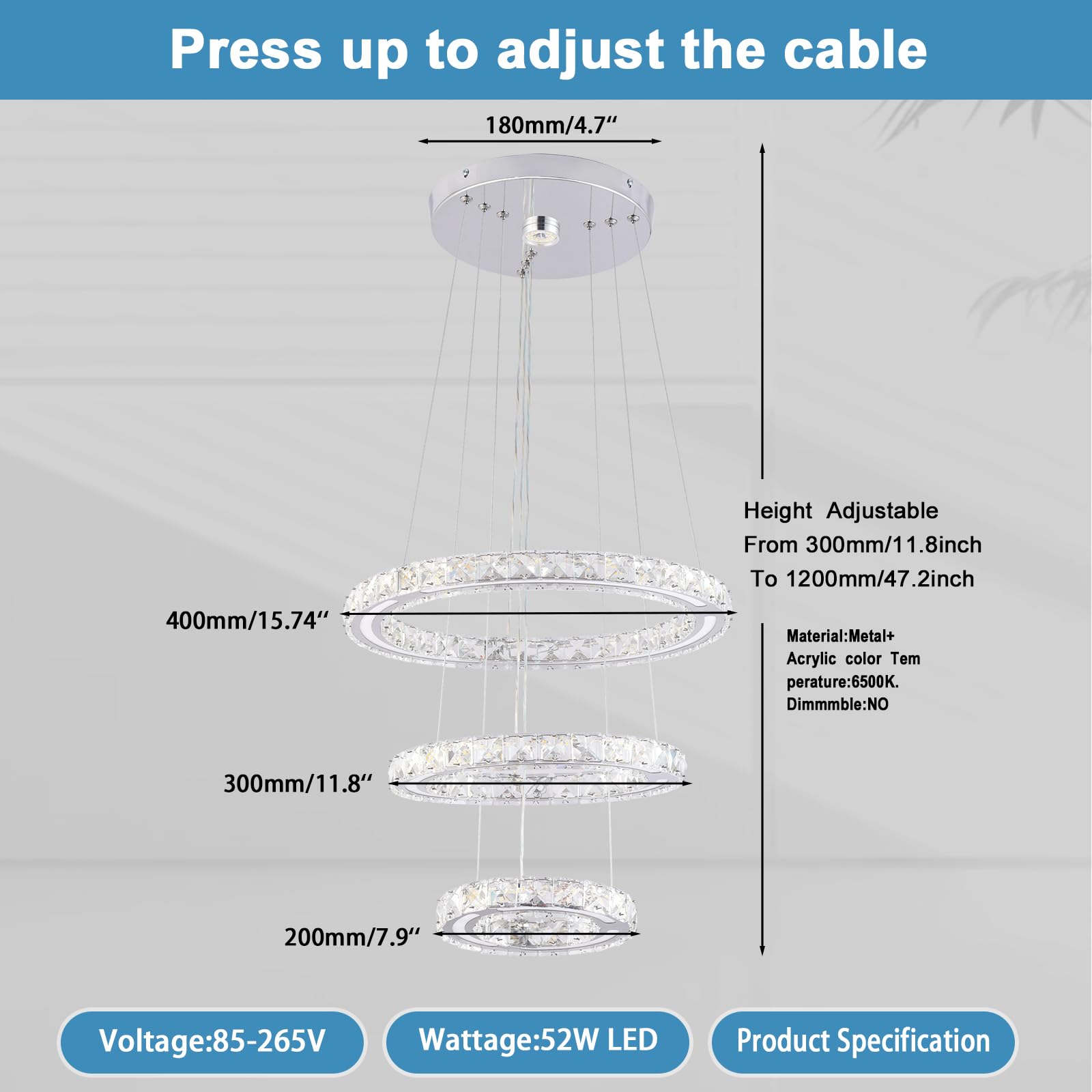 - LED Ring Chandelier Diameter:7.9”+11.8”+15.7” inch(20cm*30cm*40cm); Maximum Hanging: Height can be adjusted from 11.8" to 47.2" inch.Voltage: 85-265 Volt, Wattage :47 Watt.Light Color:Cool White (4500K-6000K).