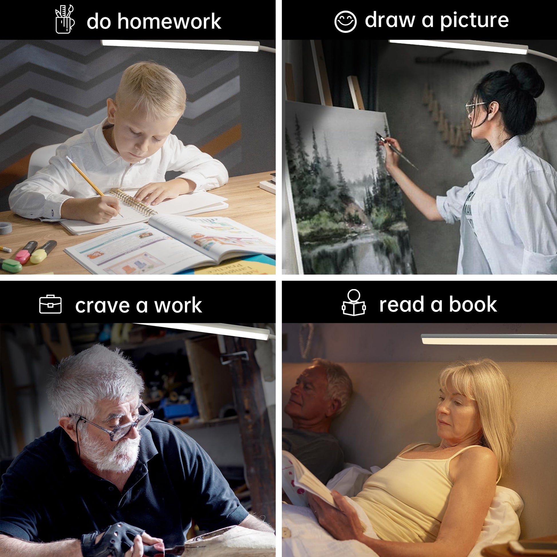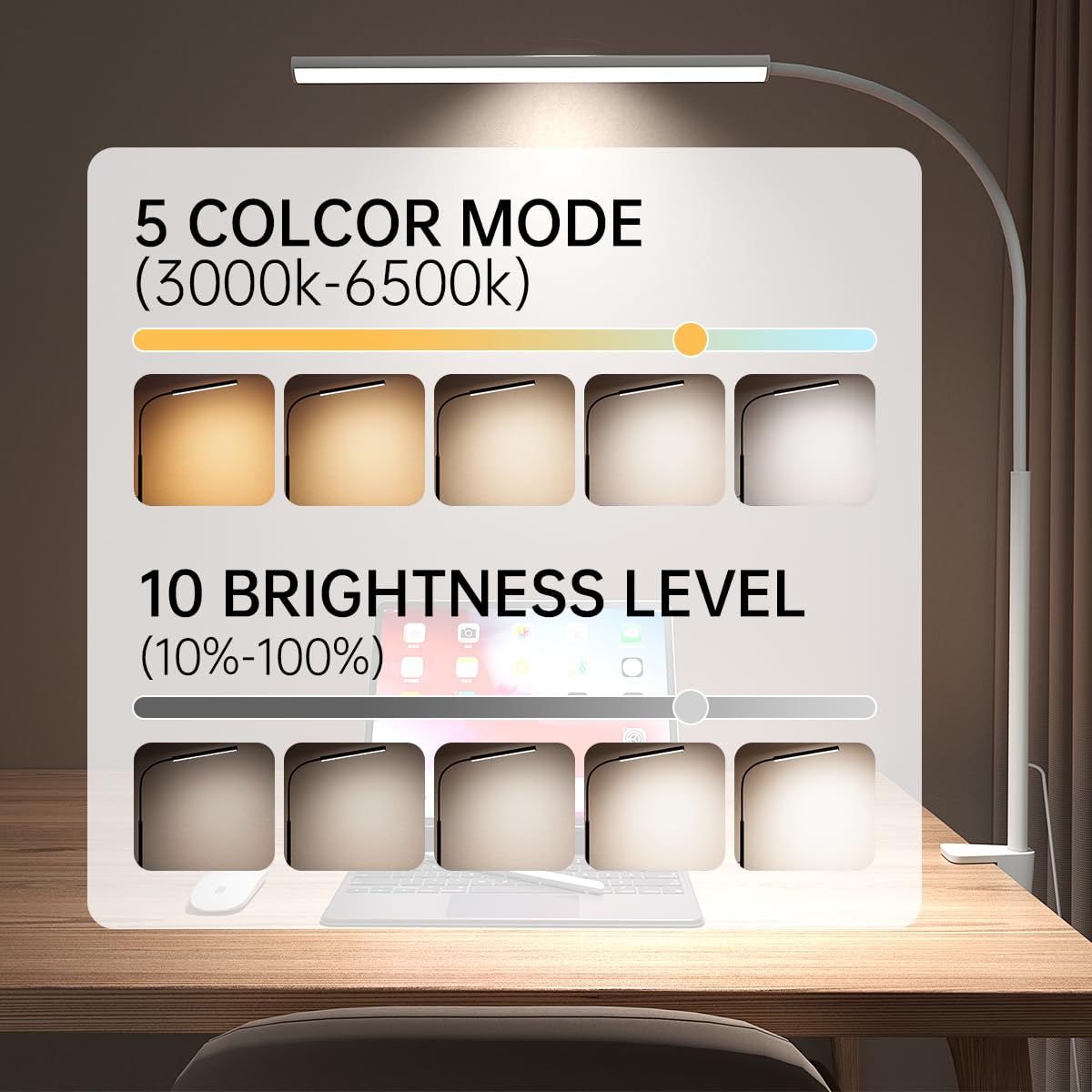 - Multiple lighting modes with memory function: Our desk lamp with clamp has 5 color temperature modes and 10 levels of brightness . It is suitable for office, study, painting and other scenes. You can adjust the color temperature and brightness according to your habits and preferences, and once you set the color temperature and brightness and turn it on again, it will automatically restore your previous settings.