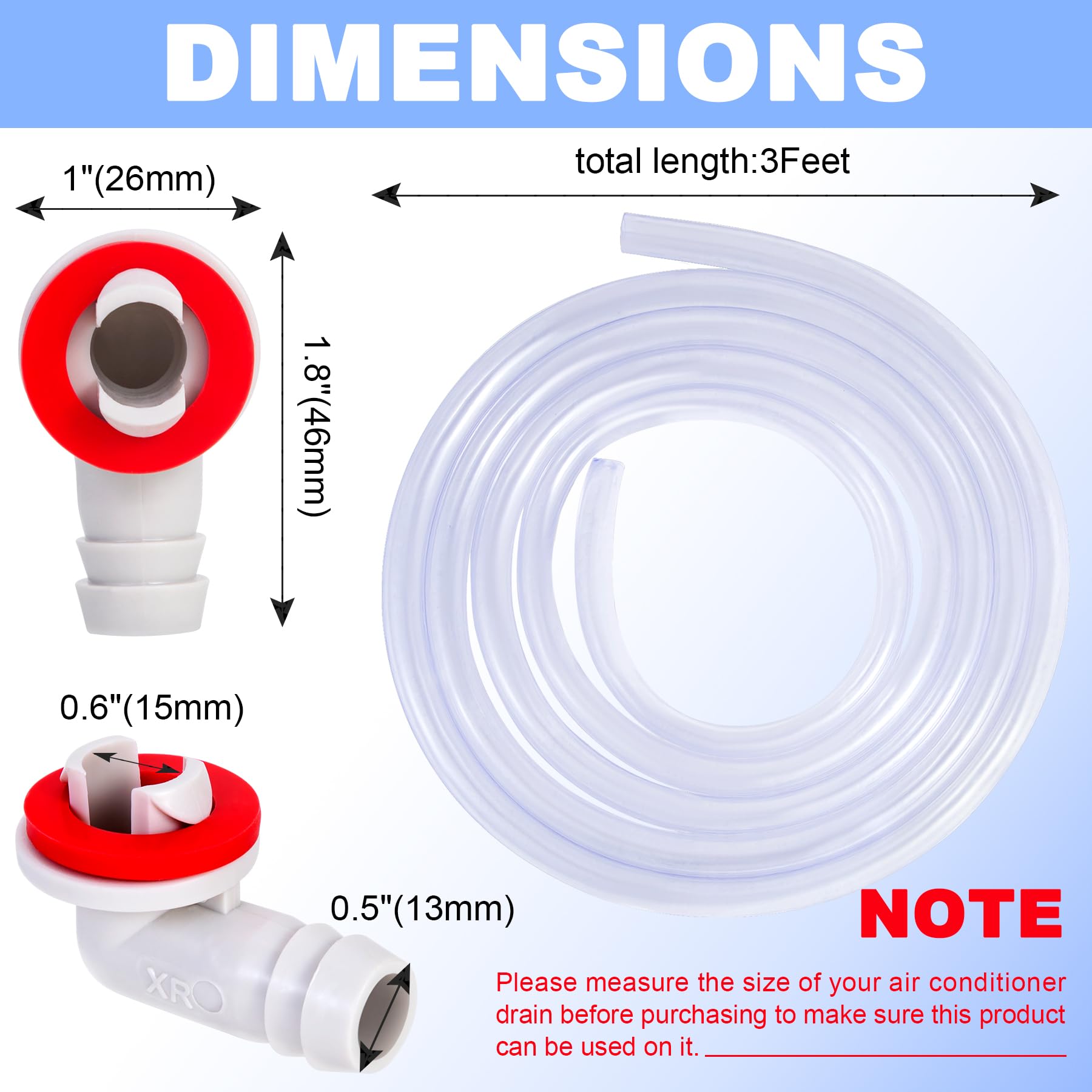 - 【General Size】Fittings are approximately 15 mm/0.6 inches and fit most air conditioner unit of mini-split units or window AC unit and universal air conditioning. The hose is 3 feet in full length and is suitable for elbow fittings. Before purchasing, please note the shape and size of the air conditioner drain hole so that the fitting will not fit.