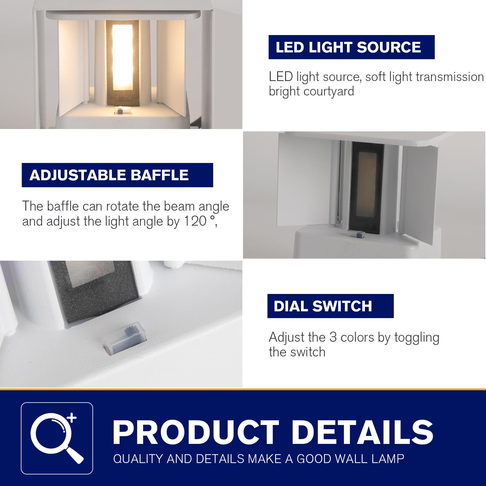 - 【THREE-COLOR DIMMING】Outdoor wall lights has three colors that can be switched. The first gear is warm light at 3000K, the second gear is neutral light at 4000K, and the third gear is cold white light at 6500K.You can freely adjust them through the light color switch inside the wall sconce