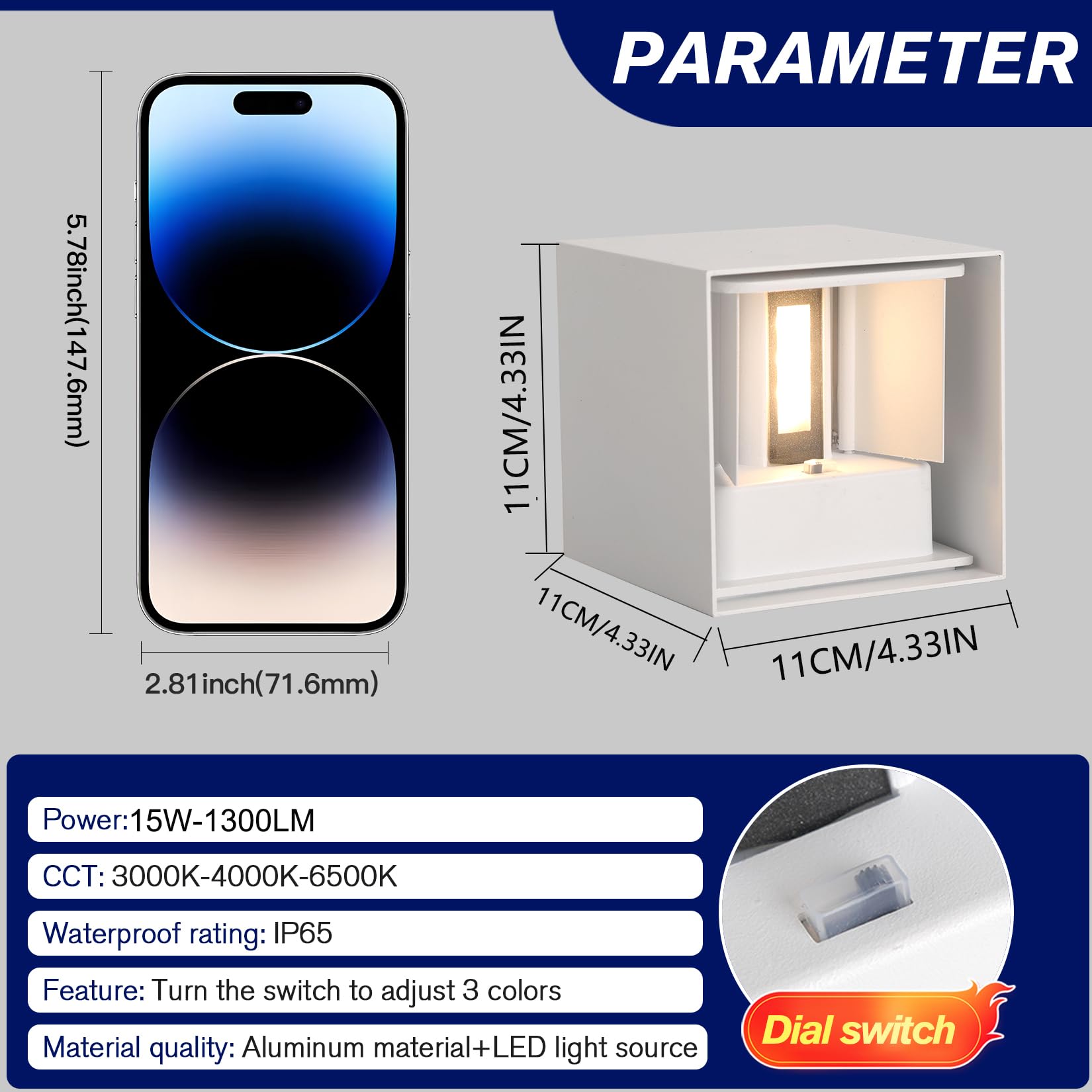 - to create a beautiful and warm atmosphere [PRODUCT SPECIFICATIONS] Waterproof outdoor lights, power 15w, square cube size 4.33" x 4.33" x 4.33" inches, lumen 1300LM, waterproof rating IP65, voltage AC85-265V. 50/60HZ, The light irradiation angle and range can be adjusted by rotating the internal baffle. The wall scones is suitable for indoor and outdoor decorative lighting