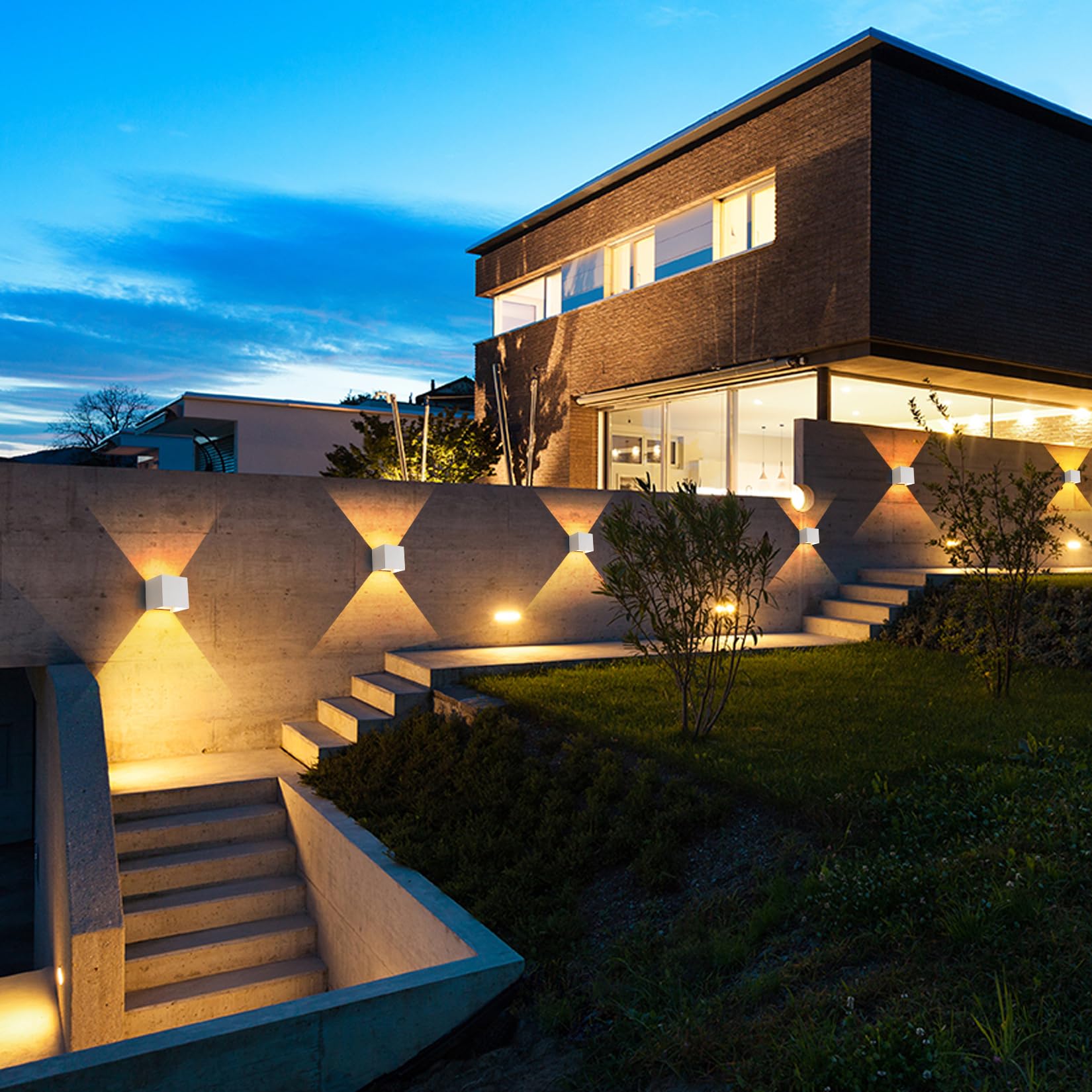 - 【MATERIAL】 Waterproof outside lights for house, using high-quality aluminum lamp body with powder coating and matte surface, modern and fashionable. Each wall lamp contains two 20W LED light sources (the light source is not replaceable), illuminating up and down. The light is bright and uniform, exterior wall sconce without stroboscopic