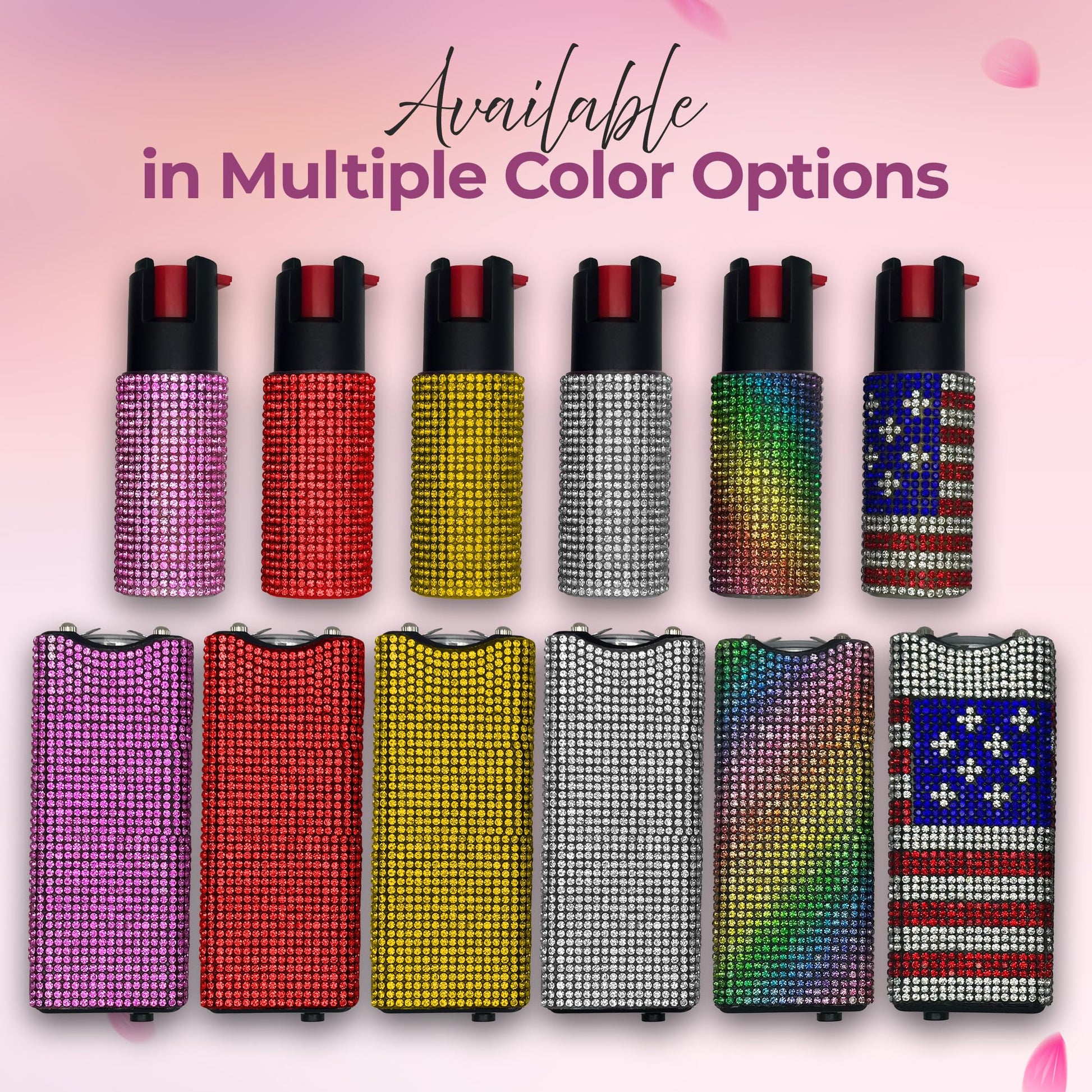 FURY Gem Stone Pepper Spray Stun Gun Combo - Stylish Multi-Color, 12ft Range, UV Dye Identifier, Flashlight, Rechargeable, Self-Defense Kit, Personal Safety, (Pink)
