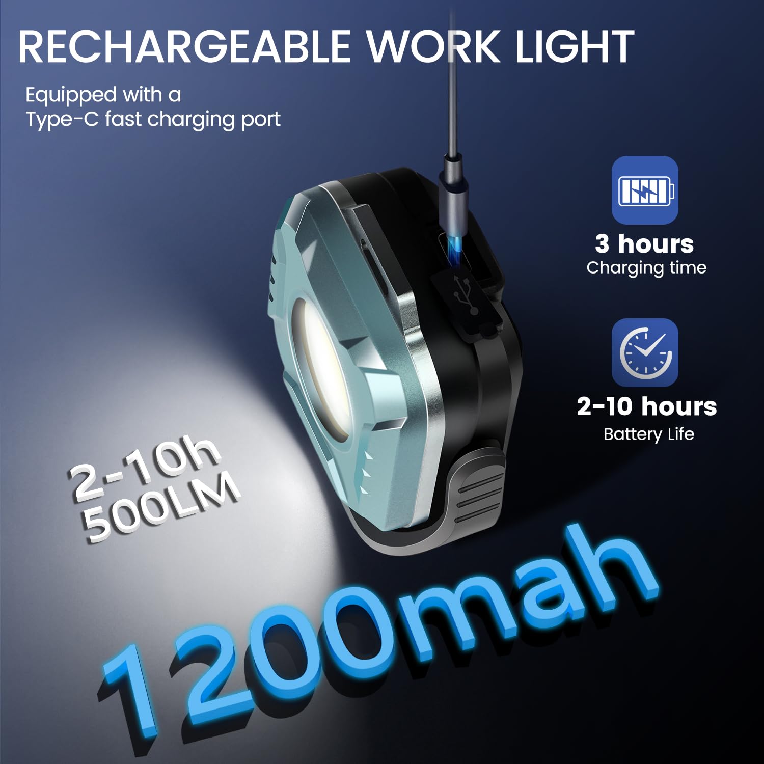 - Compact Yet Powerful: This rechargeable work light has a brightness of 500LM and a battery life of 2-10 hours. It is equipped with a 1200mAh battery and a 5.7W COB light board, providing high-brightness illumination of 500LM. Its ultra-compact design (2.4x2.2x1.1 inches, 2.9 ounces) fits easily in the palm of your hand, toolkit, or pocket.
