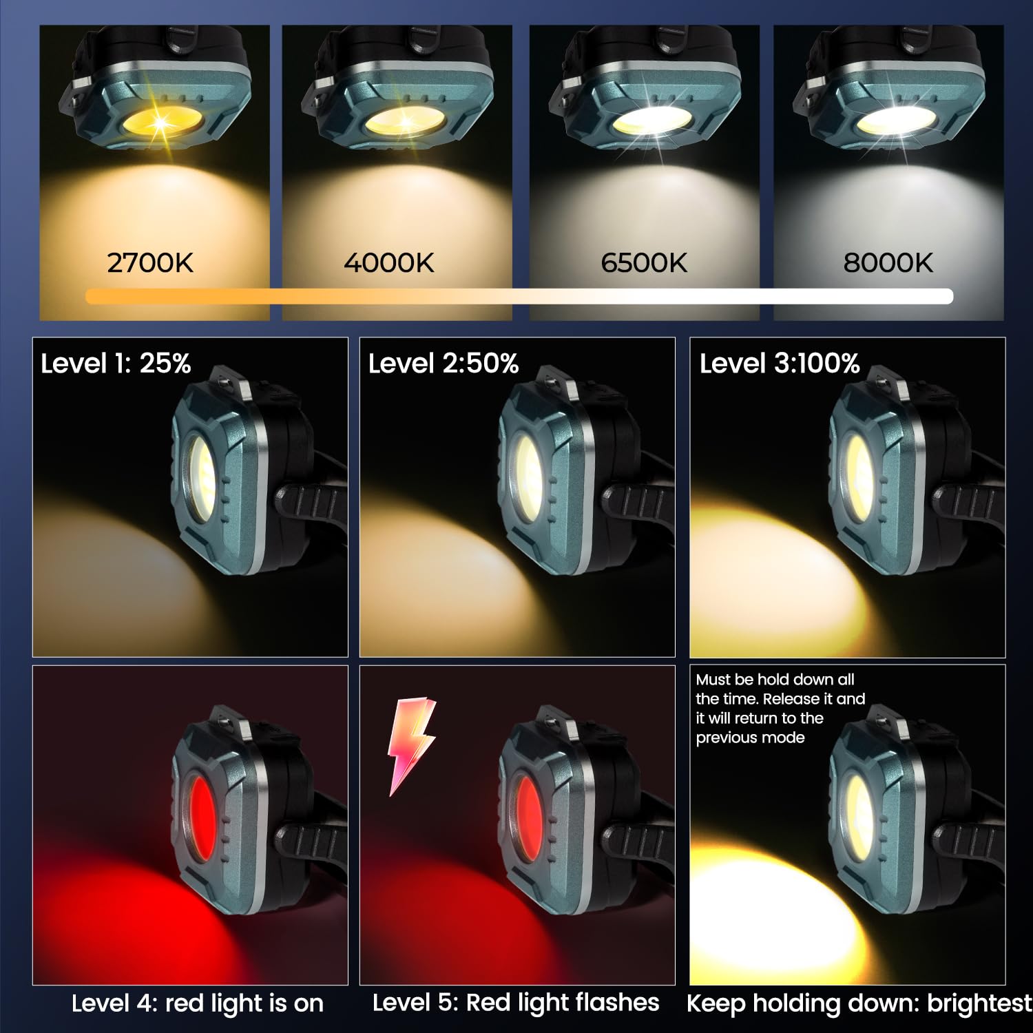 - Adjustable Brightness and Color Temperature: This magnetic work light seamlessly switches between 3 brightness levels (25%-50%-100%), 4 adjustable color temperatures (2700K-4000K-6500K-8000K), and dual red modes (steady/flashing). Press and hold the left button to instantly enter maximum brightness burst mode, ideal for emergencies or high-intensity tasks.