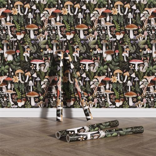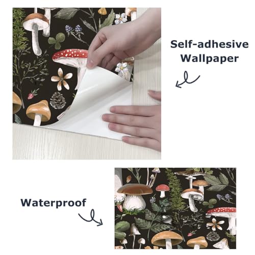 GaliGali Peel and Stick Wallpaper, Contact Paper for Bathroom/Home Decor£¬Black Boho Floral Wallpaper, Mushroom Removable Vinyl Waterproof Self-Adhesive Contact Paper, 17.3"x118", NO.A00121A-3