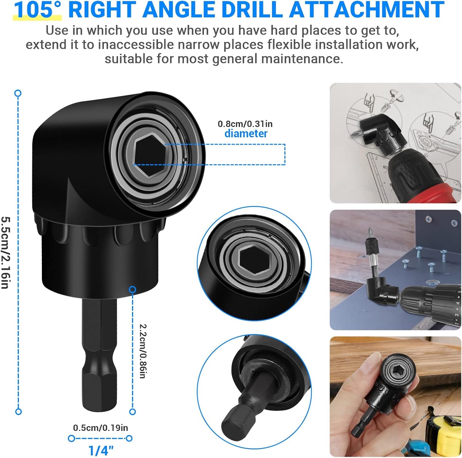 - 105° Right Angle Drill Attachment: Use in which you use when you have hard places to get to, can to connect a drill, rechargeable drill or manual wrench to extend it to inaccessible narrow places for flexible installation work. Universal socket wrench can automatically adjust to any size or shape, suitable for standard 1/4 to 3/4 inches or metric 7mm to 19mm nuts, screws and bolts, suitable for most general maintenance. Compact and portable to anywhere you want.
