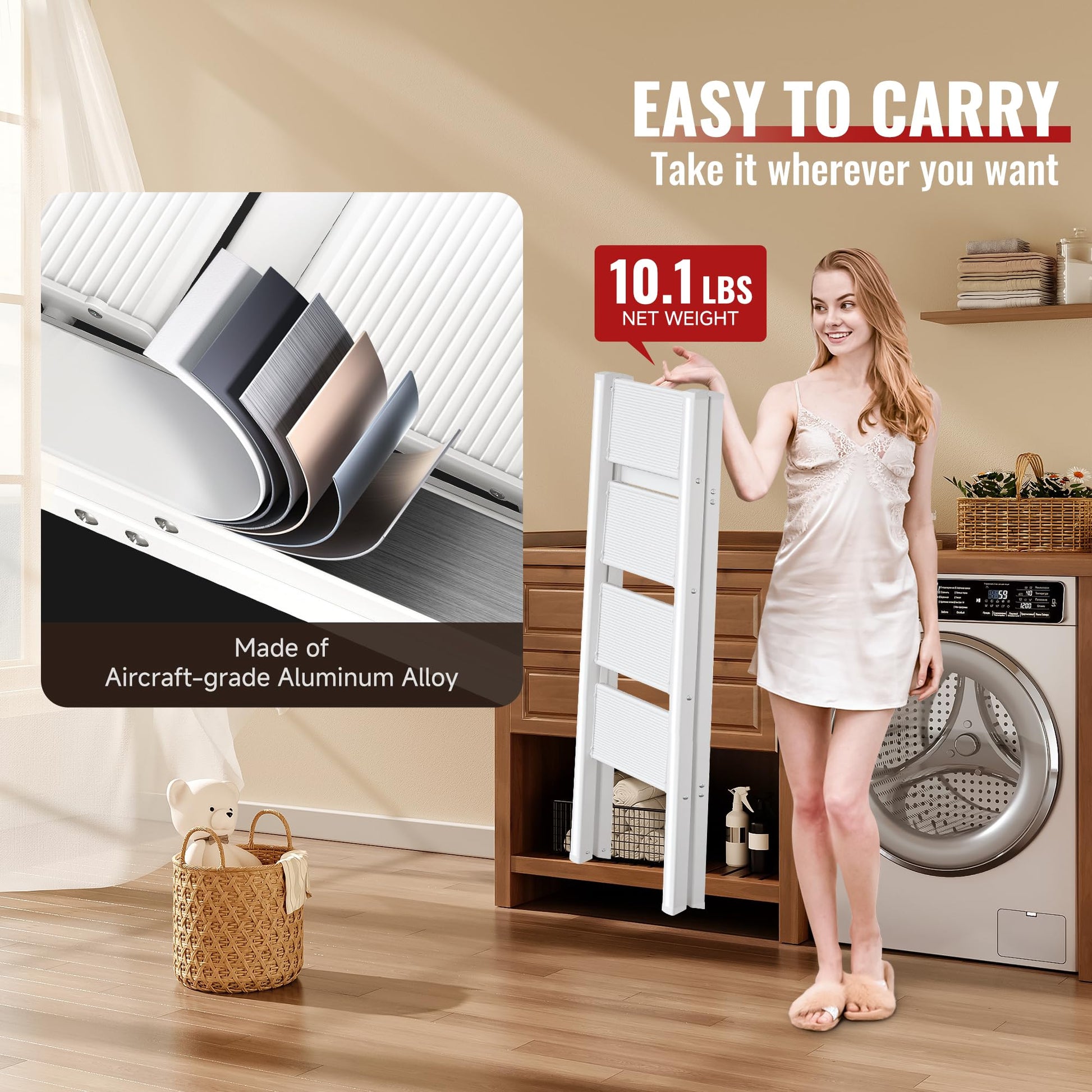 - LIGHTWEIGHT & SPACE-SAVING: The folding step ladder comes fully assembled! Our 4 step ladder is made of aluminum which is more lightweight than iron step ladder. Easily open and fold. Open: 33.9"H X 18"L X 33"W, Folded: 43.3"H X 18"L X 2.2"W, Net Weight: 10.1 Pounds, Maximum Load: 330 Pounds, Easy folding design for convenient storage and transportation