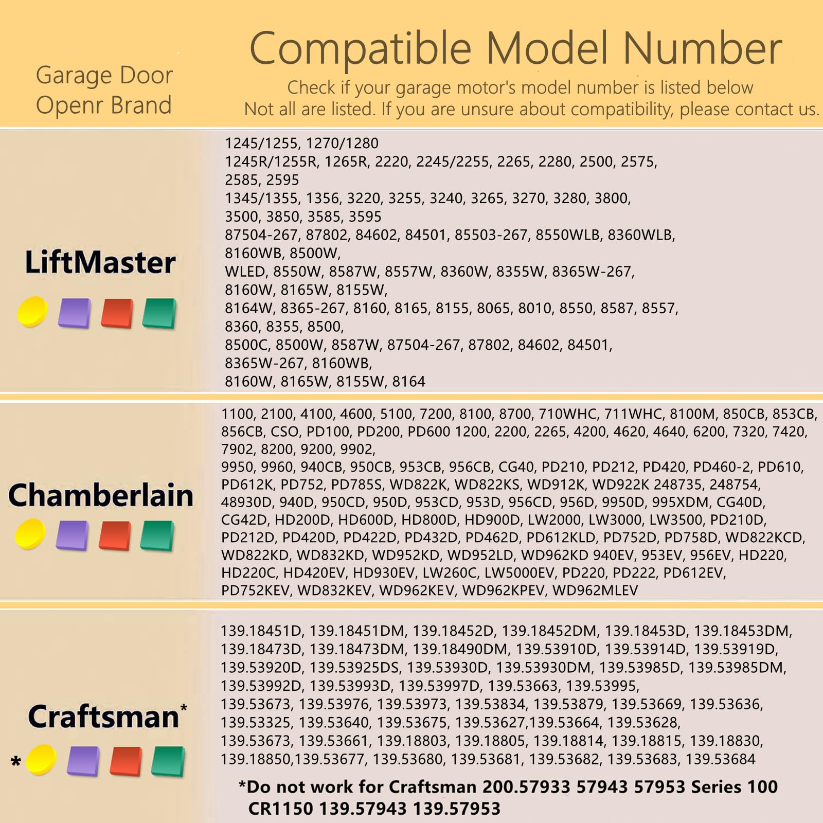 - Compatibility: the garage door opener remote works with LiftMaster, Chamberlain Purple/Red/Orange/Yellow/Green Learn Button garage door openers manufactured from 1993 to the present. NOTE: CAN'T support Dip Switch ones. DO NOT work for Craftsman 200.57933 57943 57953 Series 100 CR1150 139.57943139.57953.