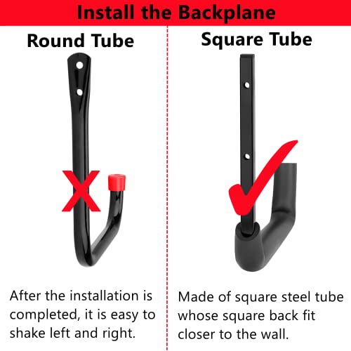 - ¡¼Heavy Duty Materials¡½Garage hooks are made of high quality square steel tube whose square back fit closer to the wall and can support up to 55 pounds, you can use two hooks as a match to hang heavy objects.