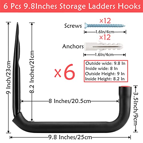 - Size & Capacity: Utility hooks is a set of 6 wall mount hooks, with 12pcs screws and 12pcs anchors, ladder hooks size is: 9Inch x 9.8Inch(H x W), wide inside 8 inch, the diameter of the tube is 0.63Inch.