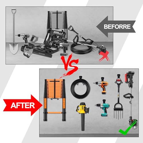 - ¡¼MULTIPURPOSE GARAGE TOOL HANGER¡½Mount it in your garden, yard, shed or garage as you wish. Perfect for hanging power tools especially like string trimmers, weedeaters, power drills, gas edgers, chainsaws, blowers and lawnmowers, or garden tools like shovels, ladders, mops, brooms, hoses, snow shove or any hangable items.