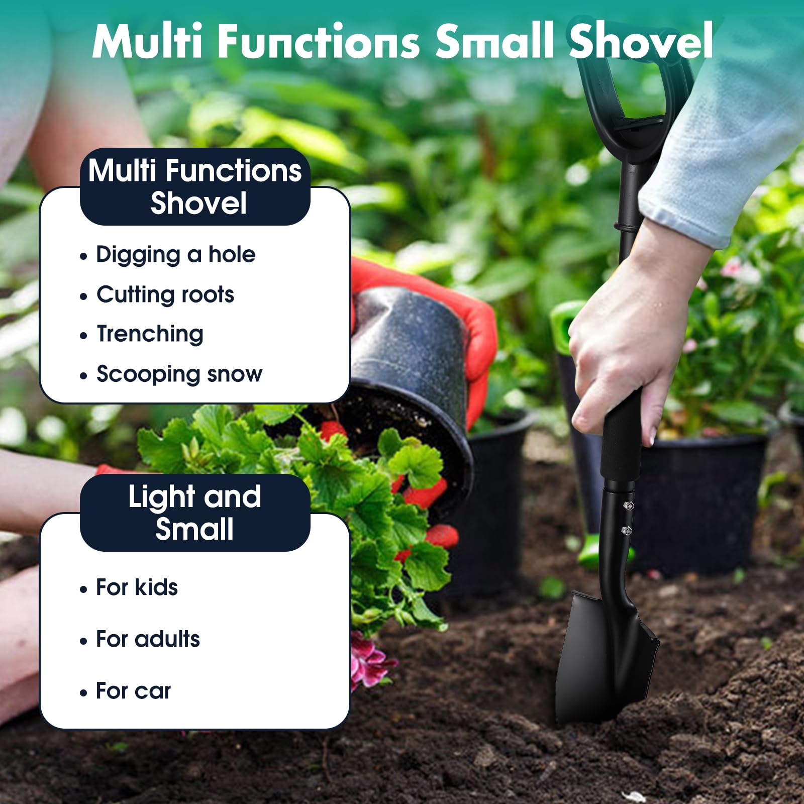 - Multifunctional Little Shovel: This handy all around spade holds up through a season of gardening, perfect for digging holes, repotting plants, trenching, moving compost, cutting great plugs out of the ground for treasure searching, camp trip, car emergencies. Also great size for kids