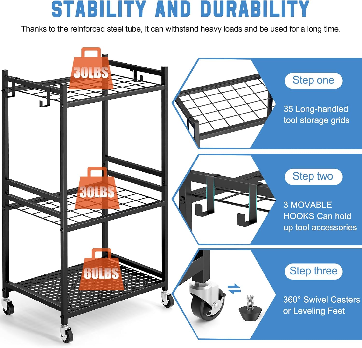 - 【INNOVATIVE GARAGE ORGANIZATION】: The garden tool organizer comes with 4 universal wheels that smoothly move through thick grass and can easily be moved from indoors to outdoors. It efficiently organizes space in your garage and shed when used indoors, with built-in brakes on the front 2 casters to keep the tool holder in position and add stability. It is also equipped with leveling feet,it is also suitable for uneven ground.
