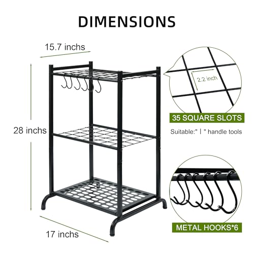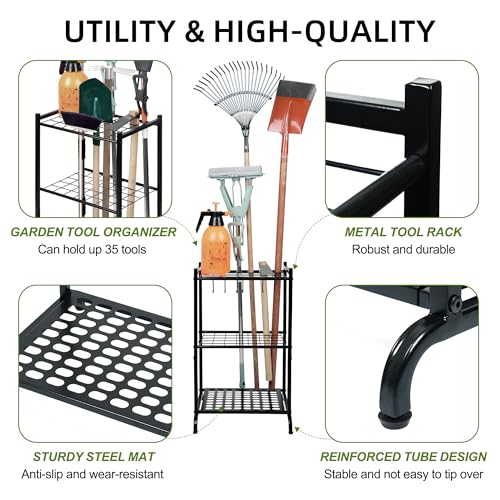 - Durable and Long Working Life: The garden tool storage rack is constructed out of heavy duty powder coated finish steel to resist chipping, peeling and rust, which ensures a long lasting working life. This garden tool organizer is designed with heavy-duty construction to withstand heavy tools.