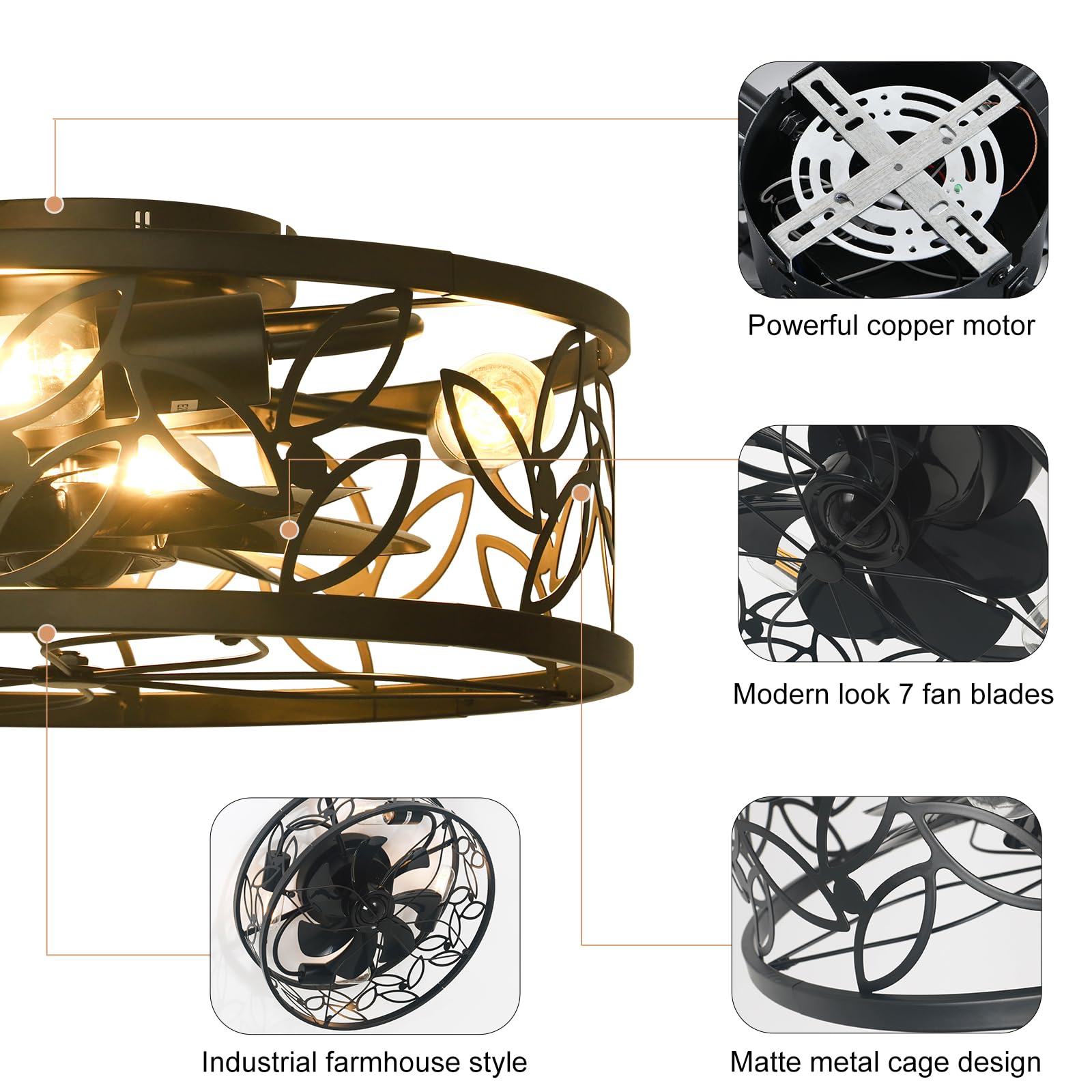 - Flush Mount Ceiling Fan Sizes -- The cage ceiling fan diameter: 18 "/46 cm , height:7.28 "/ 18.5 cm. Ceiling canopy diameter 7.48 "/19 cm, height: 2.75 "/7 cm.This farmhouse ceiling fan requires 4 x E26,Max 60W Bulbs (NOT Included).Our vintage ceiling fan with light has a stylish and versatile look with quality and texture. Farmhouse and modern style can be switched at will.