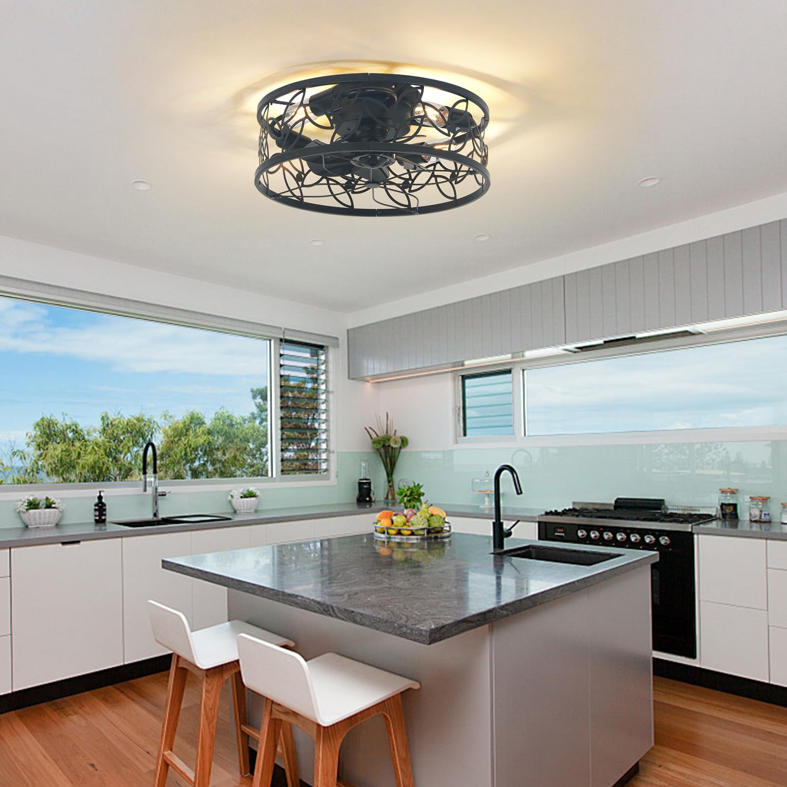 Garwarm 18in Caged Ceiling Fan with Light,Rustic Farmhouse Ceiling Fans with Lights and Remote,Bladeless Black Fandelier Ceiling Fan,Small Flush Mount Ceiling Fan for Kitchen, Bedroom(6 Speed, Timing)