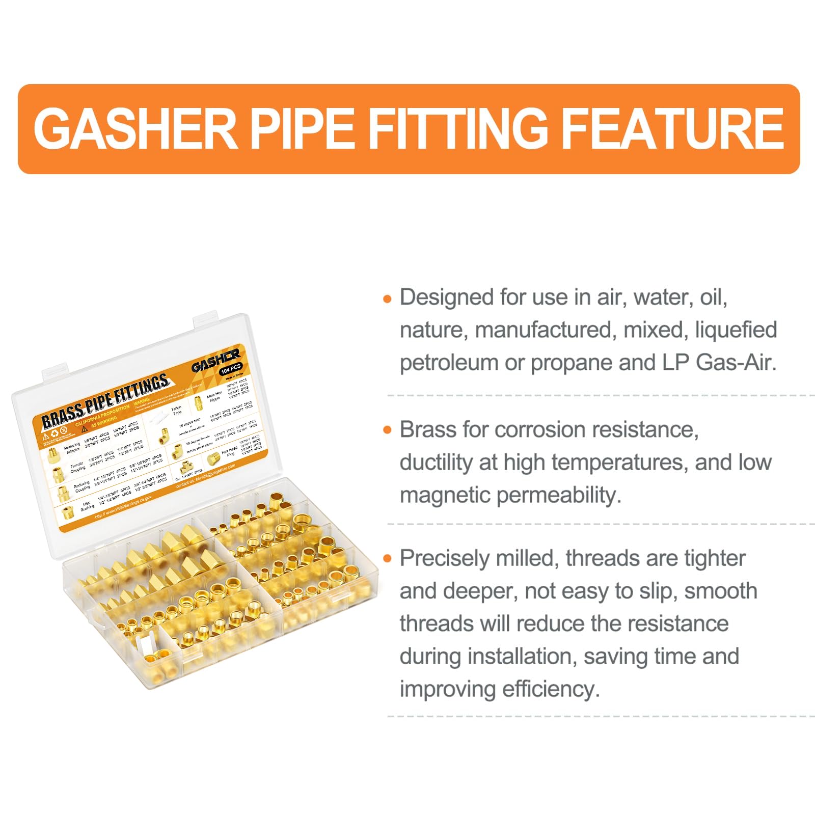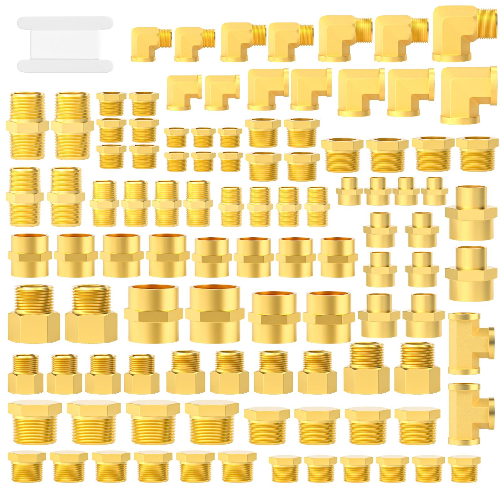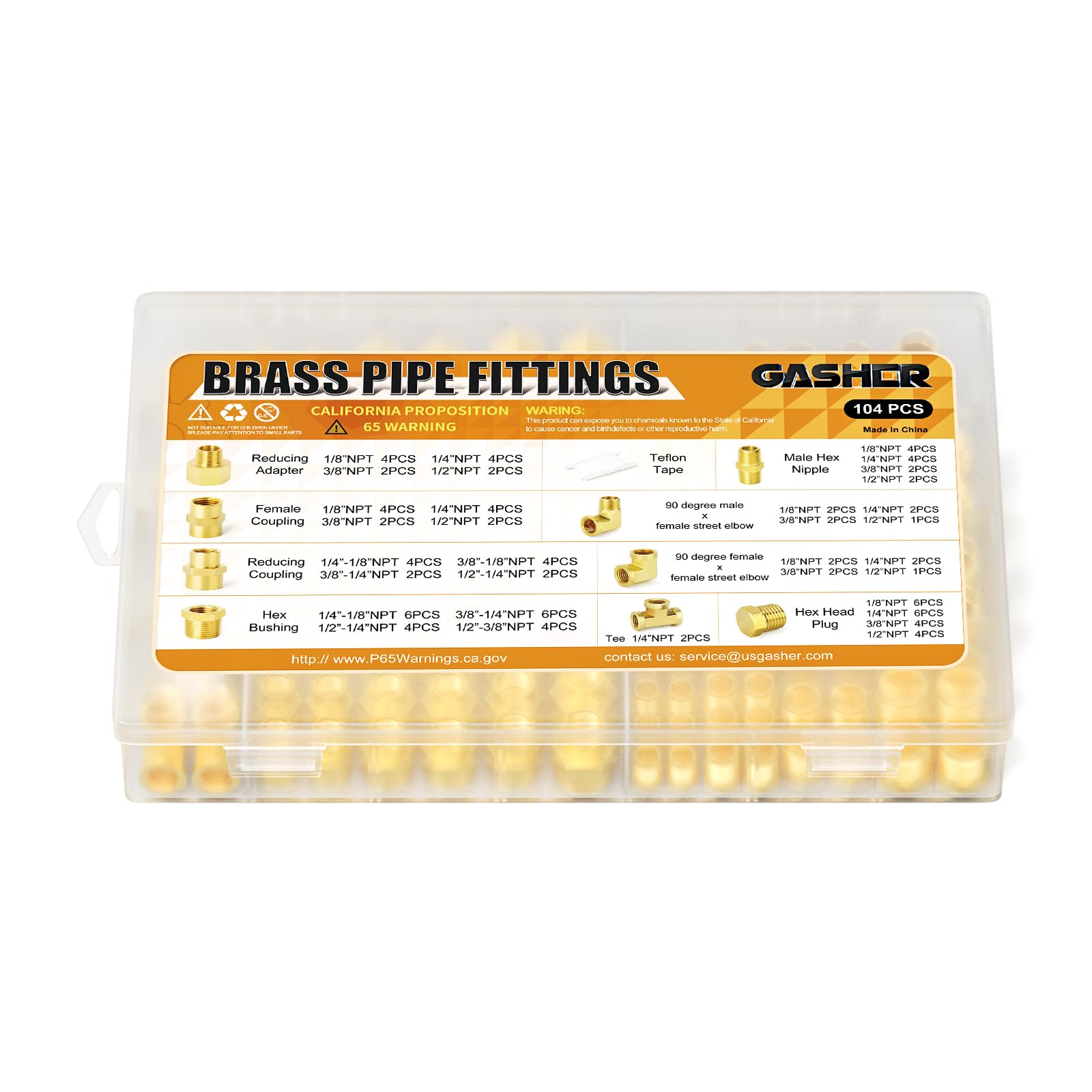 GASHER 104Pcs Brass Pipe Fittings Assortment Kit, Reducing Adapter, Hex Nipple, Female Coupling, Reducing Coupling, 90 Degree Barstock Street Elbow, Hex Bushing, Hex Head Plug and Tee Pipe Fitting