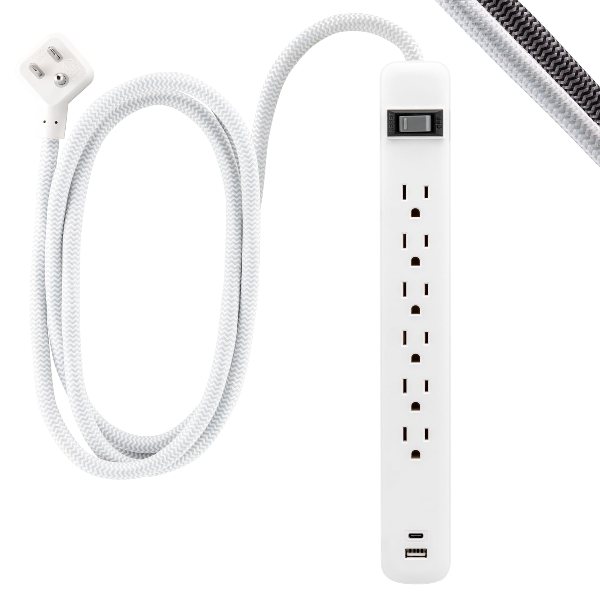 GE 6-Outlet Power Strip with USB, 1 USB-A & 1 USB-C, Outlet Extender, 6 Ft Braided Extension Cord, Flat Plug, Charging Station, White, 82594