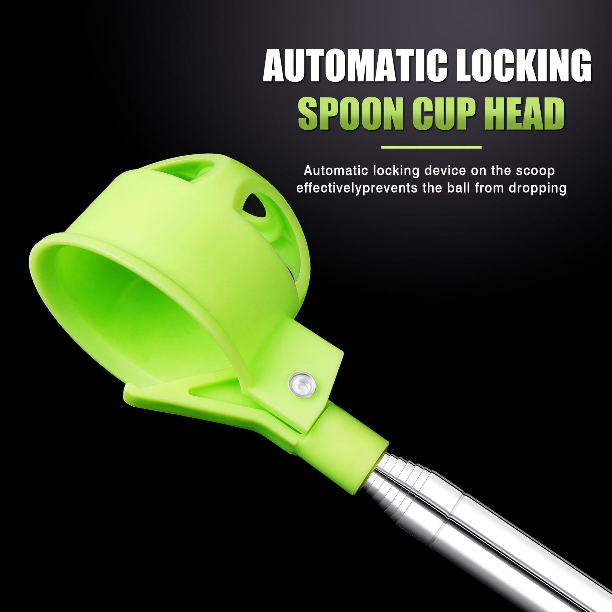 - Automatic Locking Scoop Design:The golf ball retriever telescopic with automatic locking mechanism on the scoop cup. It securely grabs and holds the ball until you want to release it, Quickly and easily pick up golf balls from water hazards, deep rough, bushes, or other tricky spots without bending or straining.