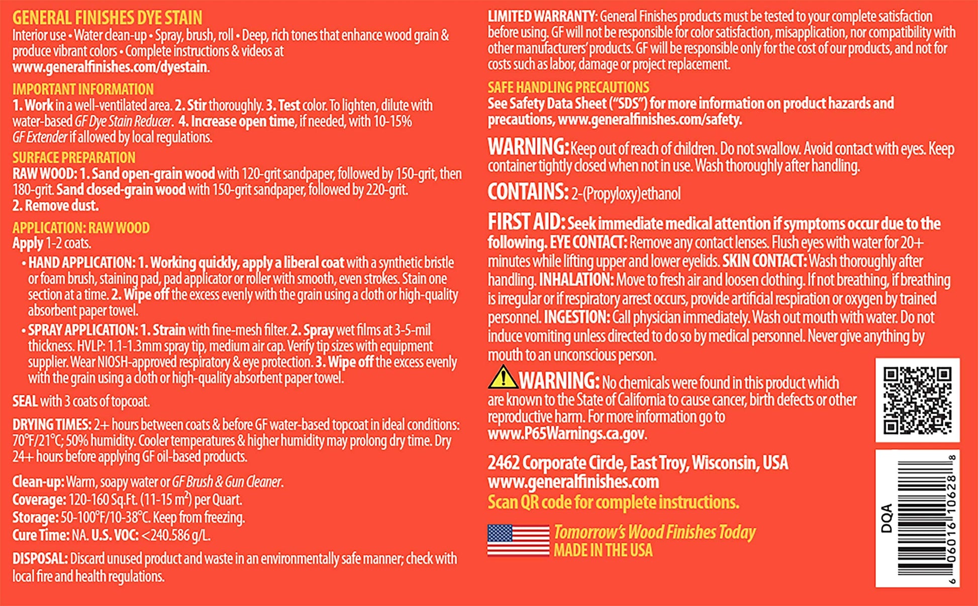 Details: General Finishes dyes are ready to use and are water based formulations designed to give you deep, rich colors without raising the wood grain. These easy to use dyes can be used straight out of the can, or for custom finishes they can be diluted with the neutral base, water or intermixed with generals other water based stains and finishes to create a full palette of colors and tones.
