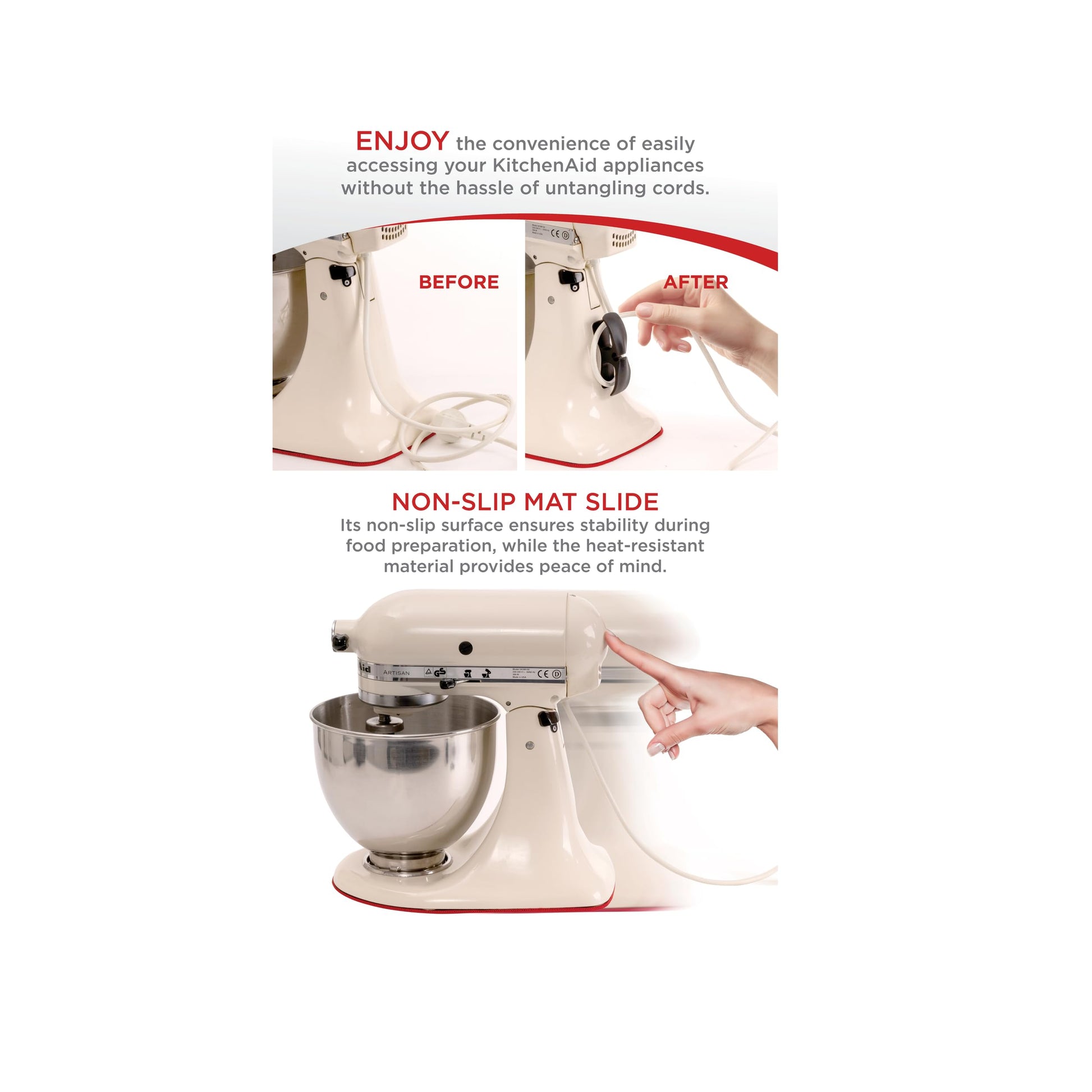 Details: Enhance Your KitchenAid Mixer with Essential Accessories If you're a passionate home cook or a professional baker, you likely rely on your KitchenAid mixer to help create delicious meals and baked goods. With its versatility and power, the KitchenAid mixer has become a staple in kitchens worldwide. However, to get the most out of your mixer, having the right accessories can make all the difference. Whether you’re looking to improve your baking efficiency, organize your kitchen space, or make your mixer more user-friendly, this comprehensive bundle of accessories for your 4.5 or 5-quart KitchenAid mixer offers the perfect solution. This set includes three essential items: a sliding mat, a cord wrap organizer, and a flex edge beater attachment. Each accessory is designed to simplify your cooking experience and help you make the most of your KitchenAid mixer. The Sliding Mat: Effortless Movement for Your Mixer One of the most common issues people face with their KitchenAid mixers is the weight of the machine. These mixers are heavy, especially when loaded with ingredients. While the sturdy build ensures longevity and power, it can also make moving the mixer across the countertop a challenge. This is where the sliding mat comes in. The sliding mat is a simple yet incredibly effective accessory that allows you to glide your KitchenAid mixer smoothly across your countertop. Whether you need to pull the mixer closer while preparing ingredients or push it back into its storage spot, the sliding mat makes the task effortless. Made from high-quality materials, this mat is durable enough to handle the weight of the mixer while providing smooth movement. With the mover slider mat pad, you no longer must struggle to lift or drag your mixer, which can also prevent scratches on your countertops. The mat provides a protective layer between your counter and the mixer’s base, reducing wear and tear over time. Additionally, the mat has been designed with an optimal thickness to ensure both stability and ease of movement, making it a must-have for anyone who frequently uses their KitchenAid mixer. This accessory is particularly useful for those with limited counter space, as it allows for easy repositioning without any hassle. Appliance Cord Organizer: Keep Your Kitchen Tidy In today’s kitchens, counter space is often at a premium. With so many gadgets and appliances, managing cords can quickly become a tangled mess, making it difficult to maintain an organized workspace. One of the accessories in this KitchenAid mixer bundle that addresses this issue is the appliance cord wrap organizer. This simple yet highly practical tool helps you keep the power cord of your KitchenAid mixer neat and organized. No more struggling with loose cords hanging off the counter, getting tangled, or becoming a tripping hazard. The appliance cord organizer wraps around the cord neatly, ensuring that it remains in place and doesn’t take up unnecessary space. The design has been improved in terms of thickness and material quality, meaning it will last longer than standard cord organizers. Made from durable materials, this cord wrap is built to withstand regular use without losing its shape or effectiveness. Its compact design ensures that it doesn't take up extra space or interfere with the functionality of your mixer. Whether you're using your mixer daily or only on special occasions, this organizer ensures that your kitchen remains clutter-free and that your cords are always neatly stored away. The cord wrap organizer is a particularly useful accessory for those who like to keep their kitchen looking tidy and organized. Whether you’re an avid cook or someone who simply enjoys a clean kitchen, this accessory can make a significant difference in how your space looks and feels. Plus, it’s easy to attach and detach, making it convenient for anyone to use. Flex Edge Beater: Improved Mixing Efficiency Mixing ingredients thoroughly is one of the key factors in achieving excellent results in baking and cooking. The standard beater attachment that comes with most KitchenAid mixers is great for many recipes, but it can sometimes leave ingredients stuck to the sides and bottom of the bowl, requiring you to stop the mixer and manually scrape the bowl with a spatula. This slows down the process and can result in uneven mixing, which is why the flex edge beater attachment is such a valuable addition to your KitchenAid mixer. The flex edge beater is designed to improve the mixing performance of your KitchenAid mixer by scraping both the bottom and sides of the bowl as it mixes. Its unique design features a flexible edge that works like a spatula, ensuring that no ingredients are left behind. This reduces the need for manual intervention, allowing you to continue mixing without stopping the machine. The result is a more efficient mixing process, improving your mixing by up to 50% compared to standard attachments. This mixer attachment is ideal for loose and thin m