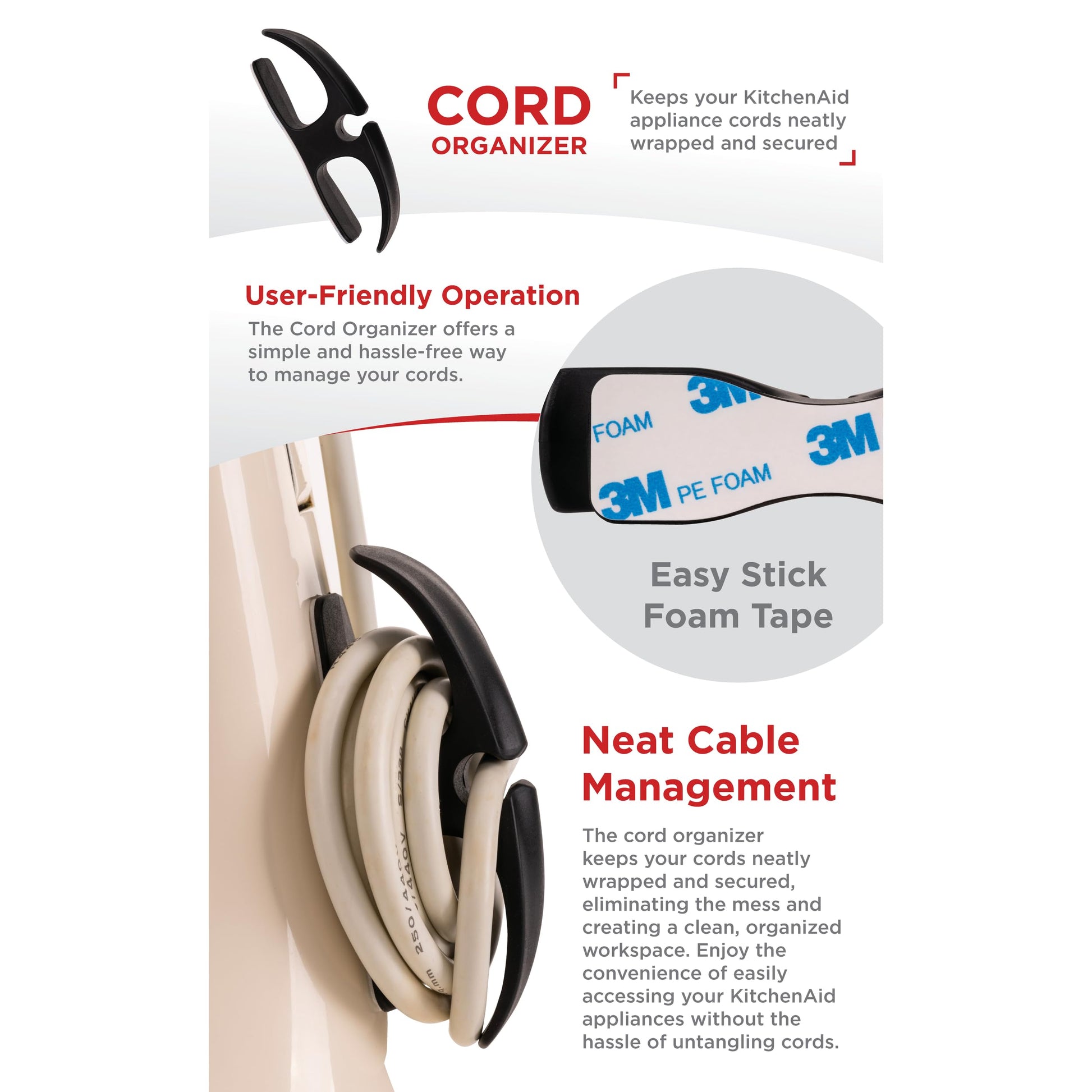 - Cord Organizer: Dealing with tangled cords is a thing of the past. The cord organizer of this bundle allows you to keep your KitchenAid appliances neat and ready to use whenever you need them. Make your kitchen more organized.