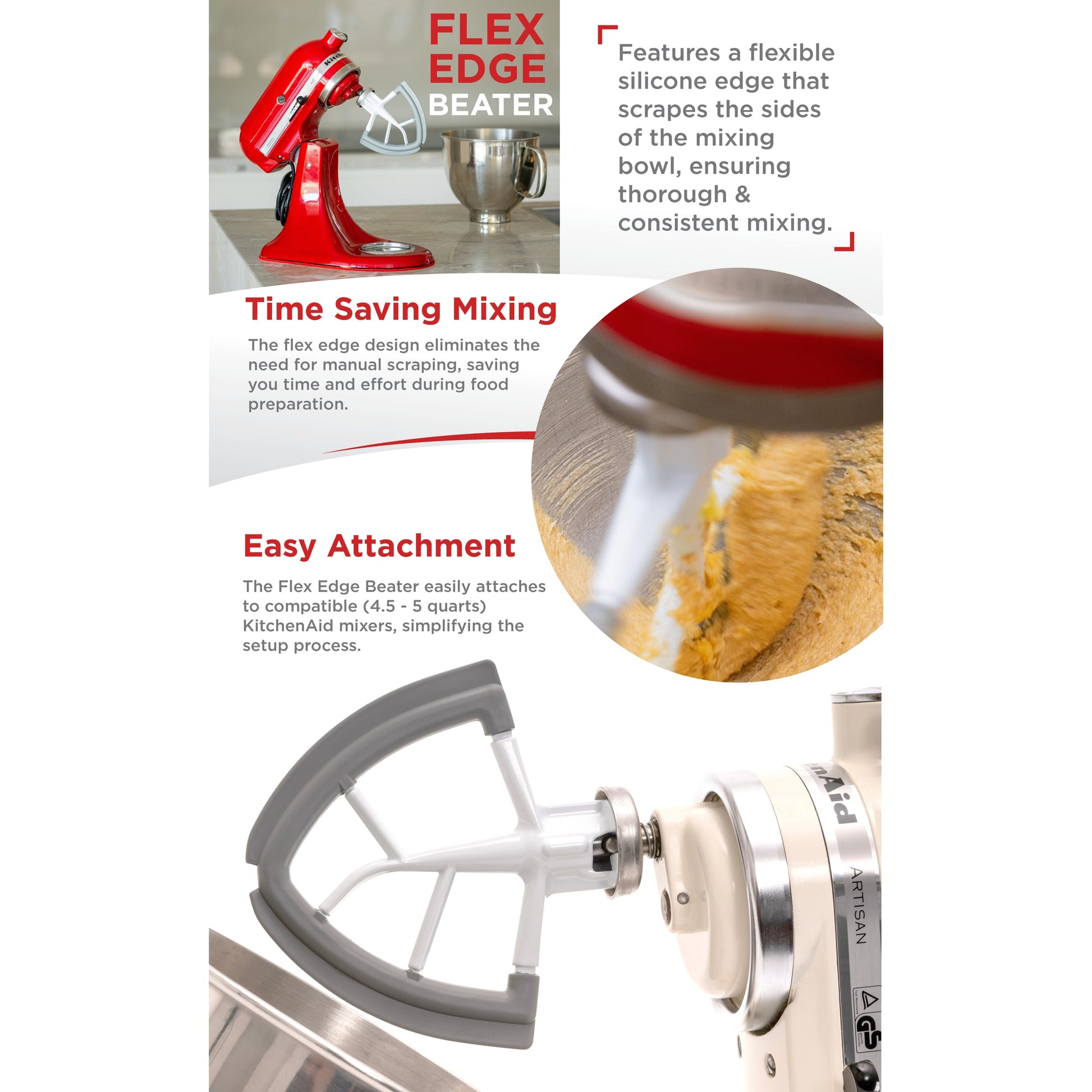 - Flex Edge Beater: Upgrade your kitchen experience with the KitchenAid bundle: Mat slider and Flex Edge Beater. This beater is designed to scrape ingredients for thorough, fast mixing, enhancing your cooking and baking process.