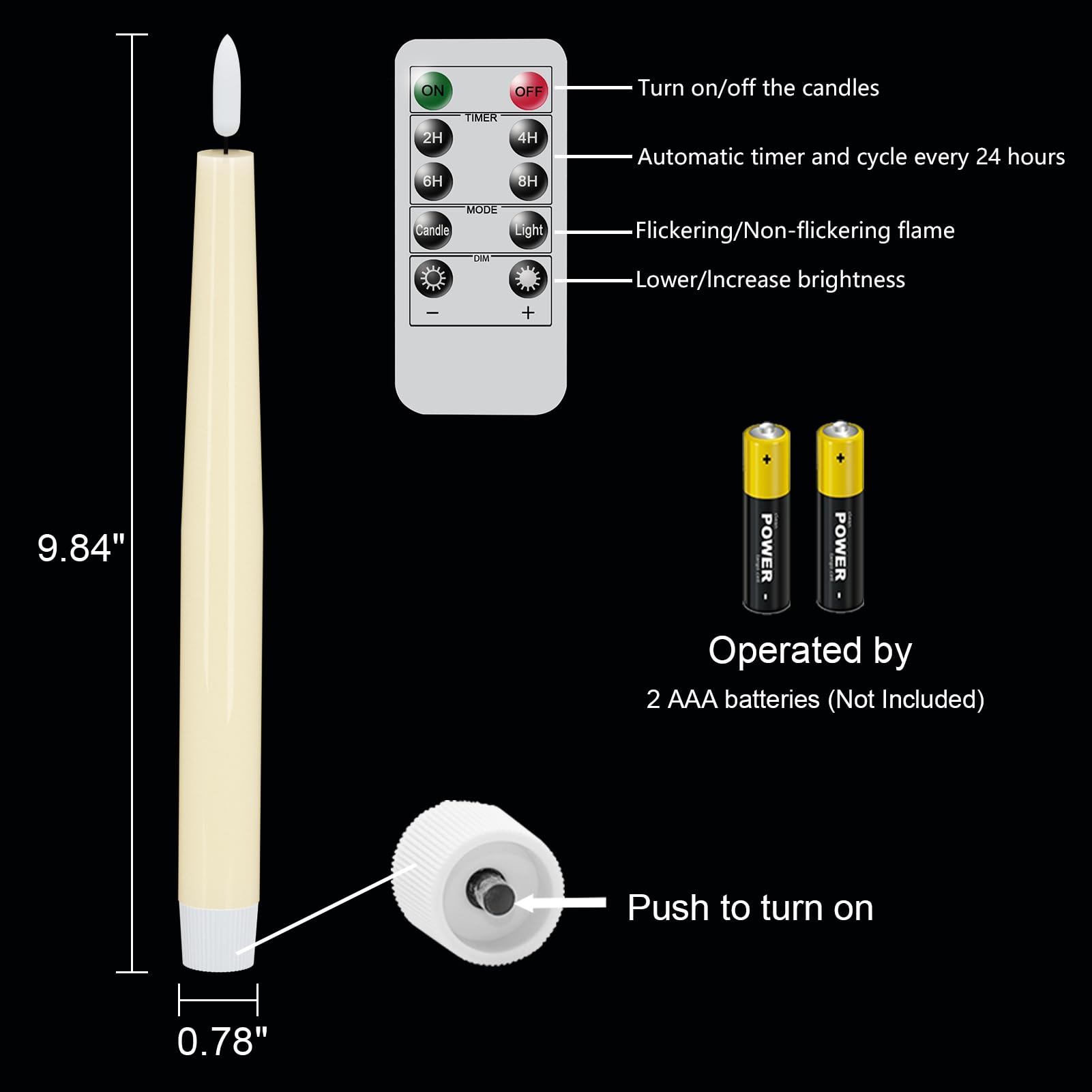 - 10 KEY REMOTE CONTROL: Press the bottom switch and all flameless taper candles can be remote by 10-Key remote control. Four timer modes(2/4/6/8H), the taper candles will cycle every 24 hours once set, there is no need to turn on/off button every time use. With two light modes, flickering or steady light and adjust brightness, you can adjust the flicking candles at will to meet various decorative needs