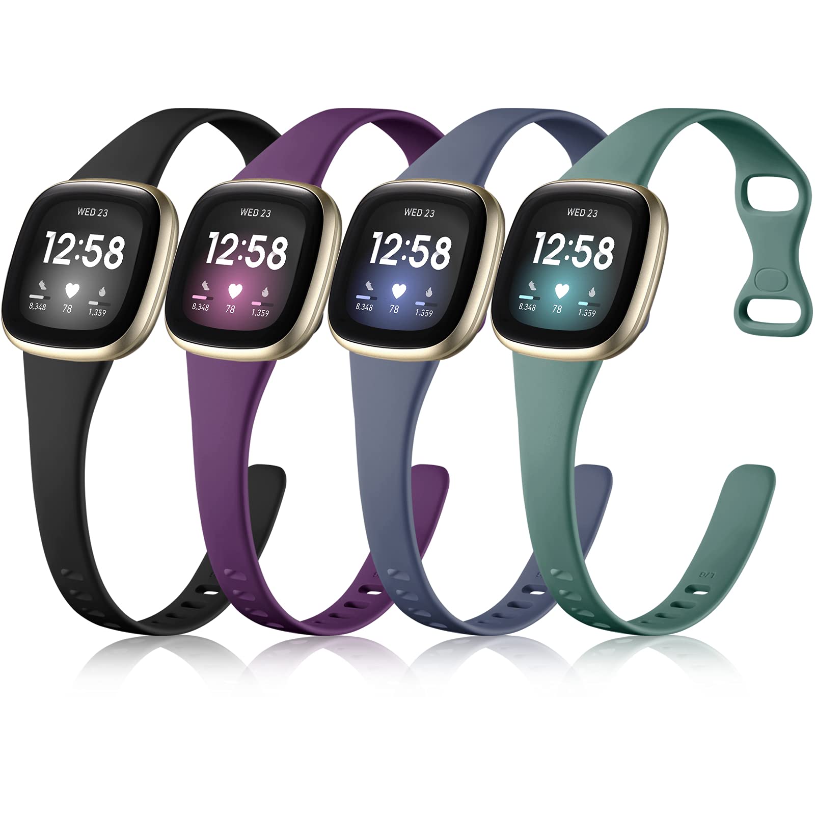 Getino Compatible with Fitbit Versa 3/ Versa 4 Bands/Sense/Sense 2 Bands Women, Sport Soft Accessories, Slim Band for Fitbit Versa 4/ Versa 3/ Sense 2/ Sense, Small Black/Plum/Bluegray/Pinegreen