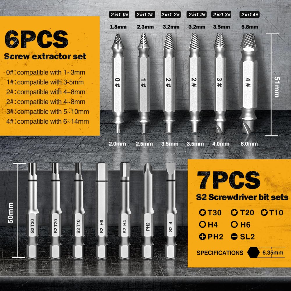 - VERSATILE SET FOR ALL DRILLS : This 16-piece screw extractor set includes 6 double-headed extractors (#0, #1, #2, #2, #3, #4) and 7 common screwdriver bits (T30, T20, T10, H6, H4, PH2, SL4), 3 PCS Twist Drill Bit compatible with screws and bolts from 3-12mm. Ideal for removing broken, damaged, rusty, or painted-over screws, making it perfect for DIY projects and home repairs.