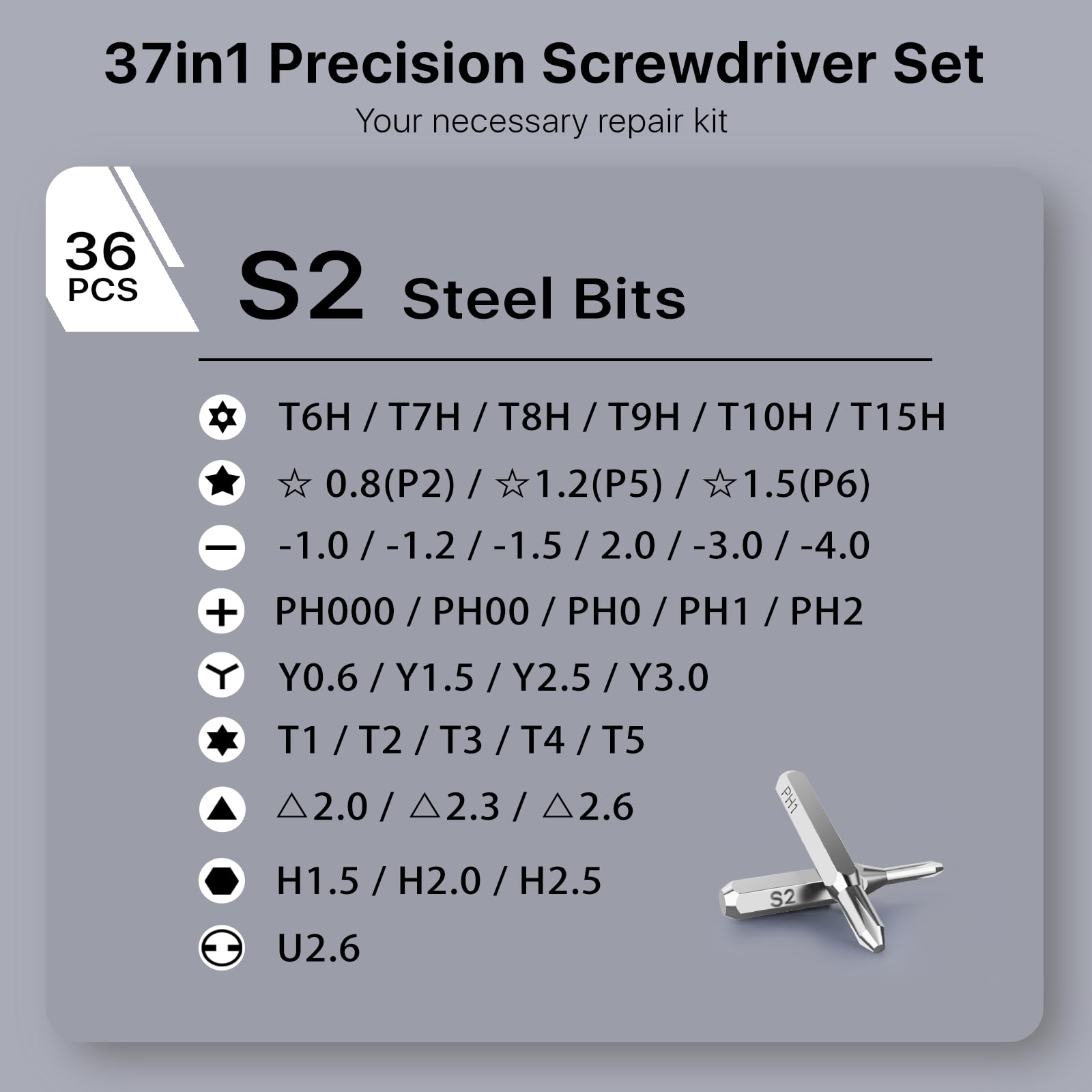 - [37in1, Household Must-Have] The small screwdriver set comes with 36 different bits (Phillips, Flat, Torx, Torx Security, Pentalobe, Hexagon, etc.), ensuring you have the smallest but complete set of repair kit. No more worrying if they need a "specific tool" — It’s a "safe but thoughtful" gift for anyone who likes to fix small electronic (or just needs a reliable tool on hand).