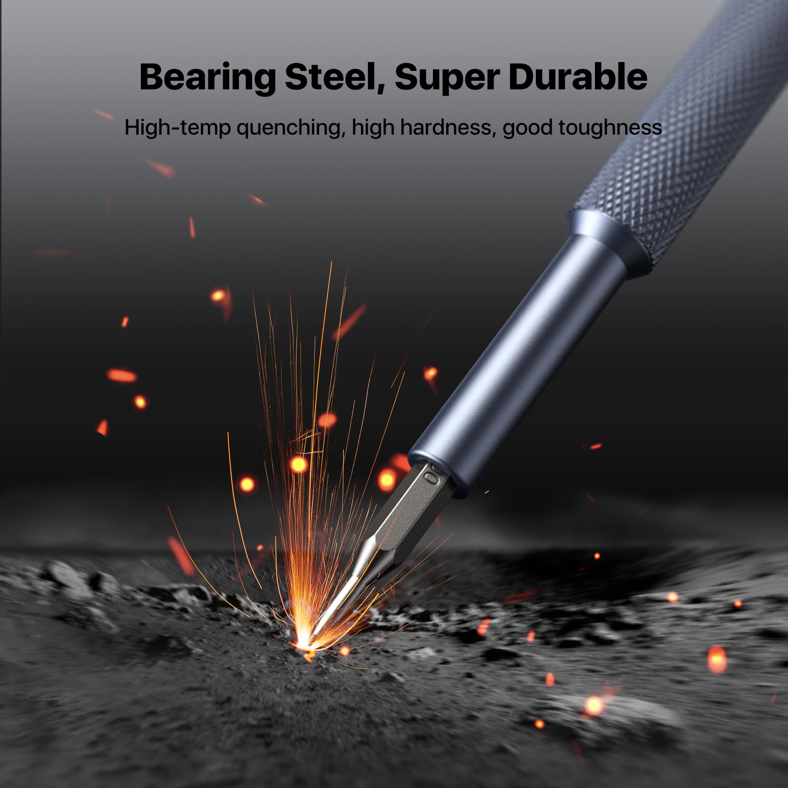 - [Bearing Steel Bits] All precision bits are made of the best Bearing Steel (Steel for tanks) and the hardness can reach over HRC65°, resist abrasion, oxidation and corrosion, ensure long time use. In addition, the strong magnetize-able tip easily pick-up and hold screws, helping you handle all tiny screws.