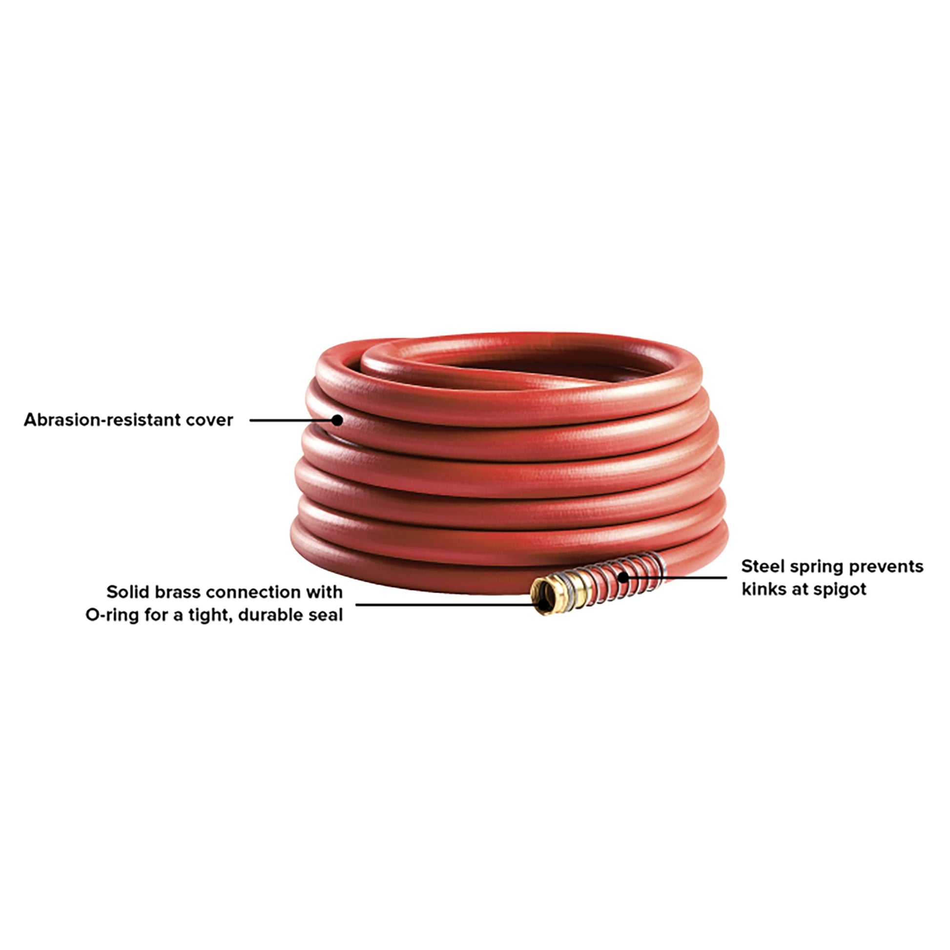 - Outdoor hose is made of double-reinforced, commercial grade rubber and vinyl with a rugged, abrasion-resistant red cover that won’t mar surfaces