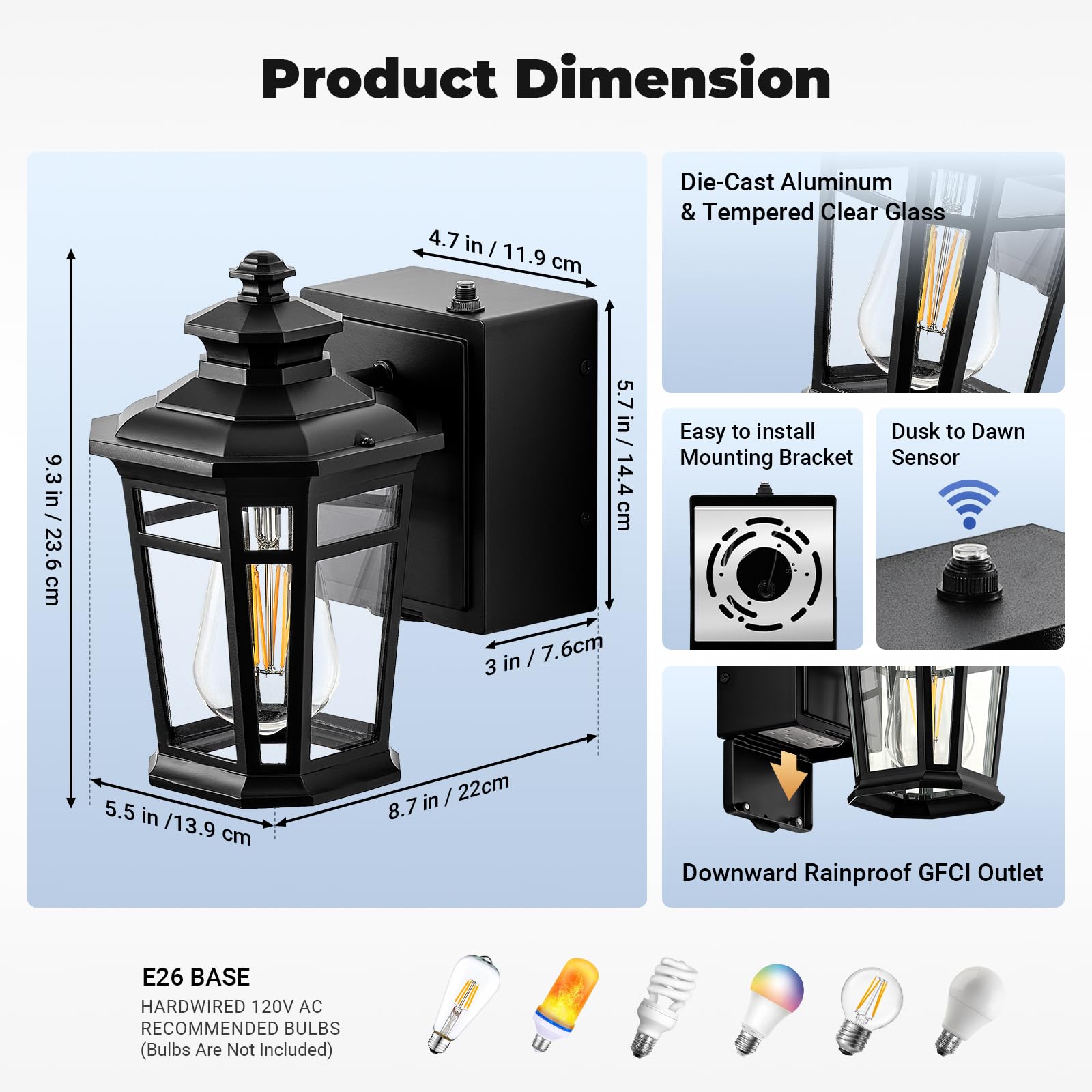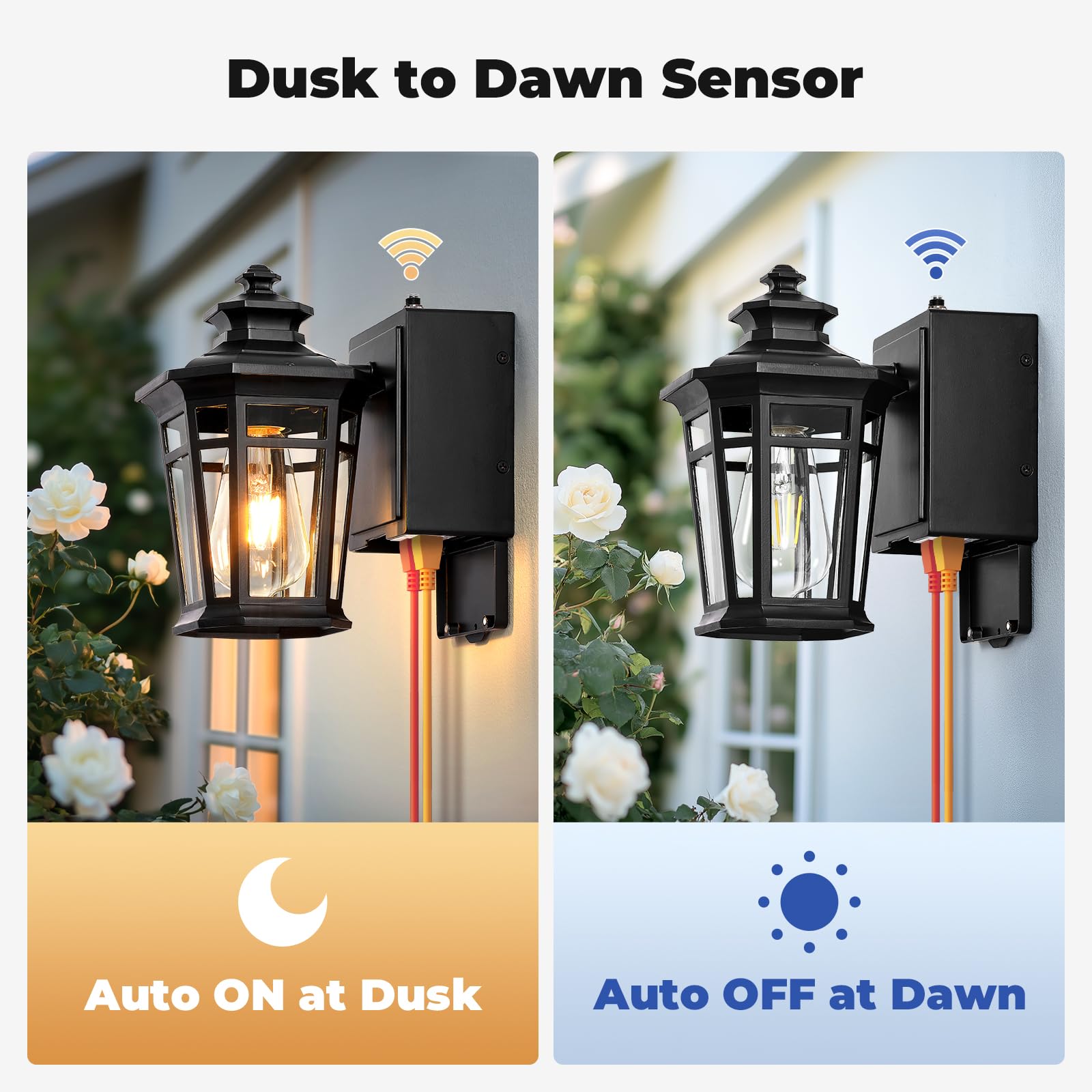 - Advanced Dusk to Dawn Sensor: Our cutting-edge outdoor light fixture wall mount featuring an advanced light sensor. This intelligent sensor automatically detects changes in ambient light: auto-turn on at dusk and turn off at dawn by detecting ambient brightness. No more manual switches—enjoy hassle-free illumination around your home.