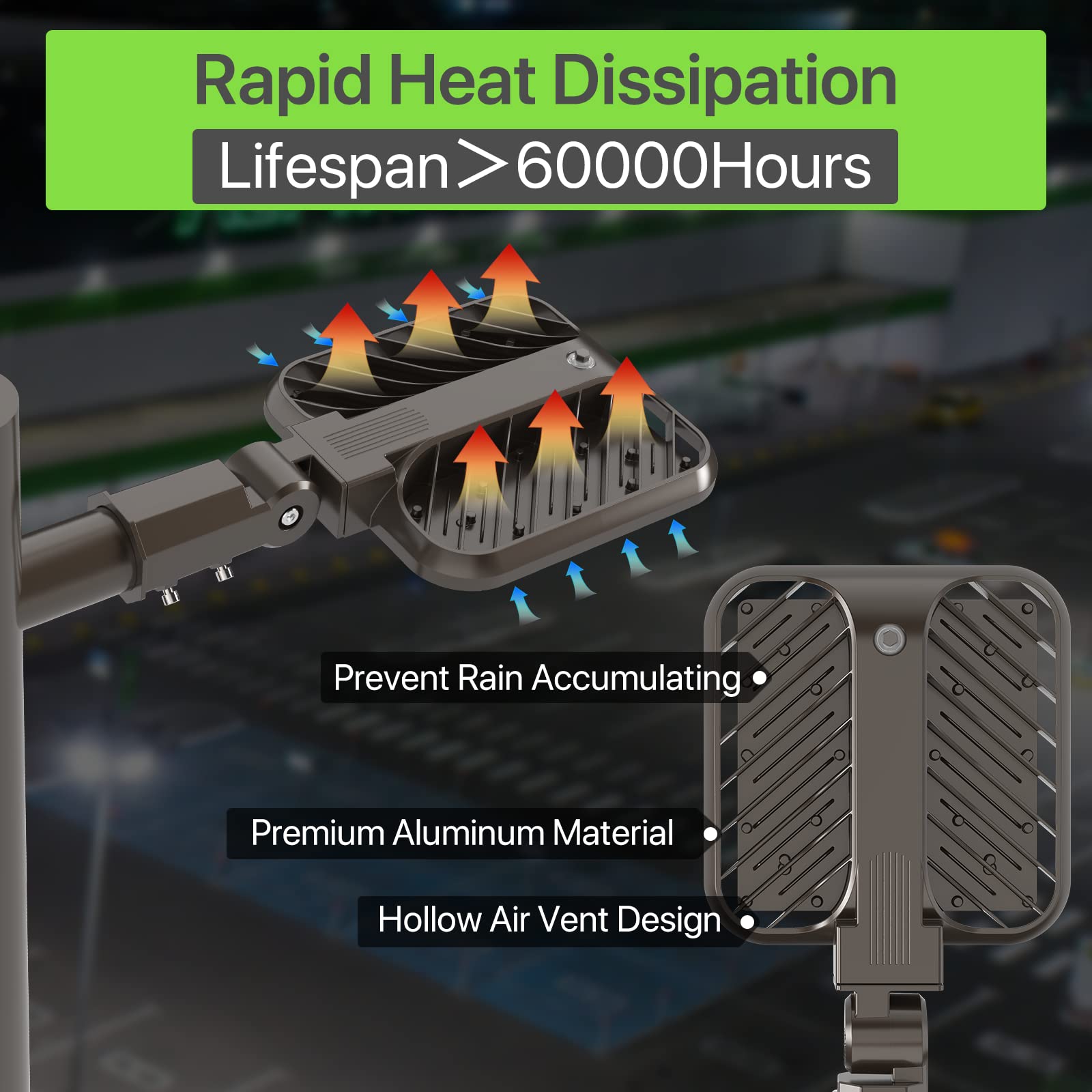 - Premium and Durable. Equipped with quality cast aluminum housing, high efficiency driver, thick cooling fin and hollow air flow design, this street pole light has excellent heat dissipation, which means it can be used for up to 60000 hours. Note: Inner Diameter of the bracket is 6cm/2.36inch. So it will fit on about 2.36inch diameter pole