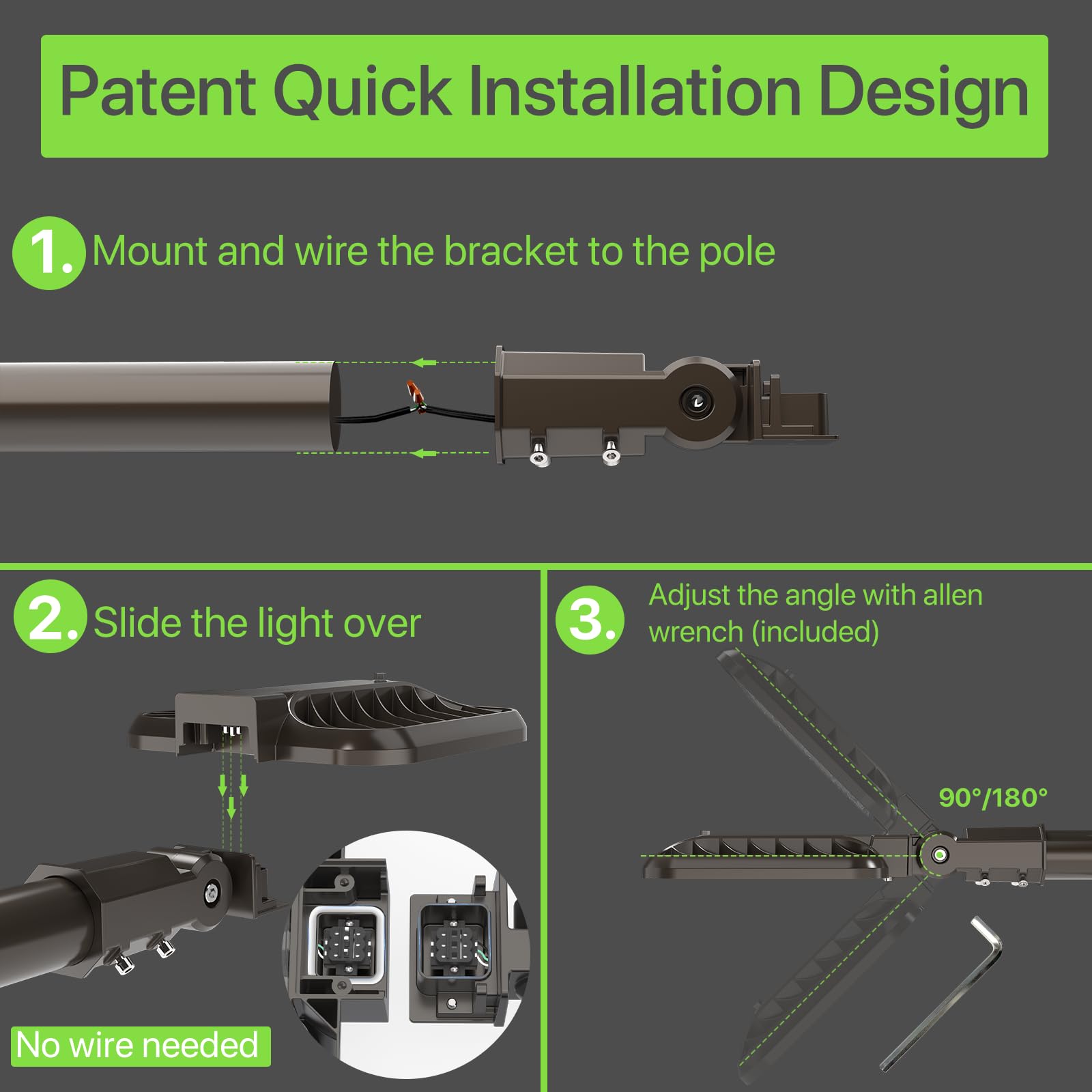 - Patent Quick Installation Design. For this slip fit mount parking lot lighting, no wire needed to connect light body and the bracket. Just attach and wire the bracket to pole first and then plug in the lamp. Save your energy and time. Friendly to mass installation. What’s more, one big Allen Wrench is included in the package to help you adjust the angle from -90° to +90° easily