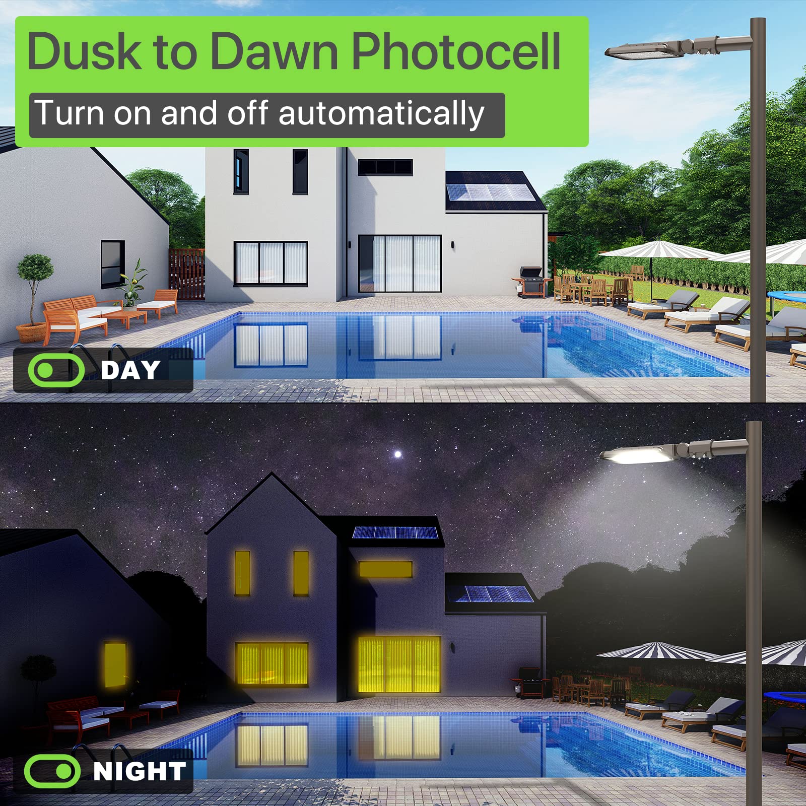 - Optional Photocell. This security light turns itself on at dusk and off at dawn automatically. Remove the black cap to open sensor function and cover the cap to close it. This IP65 waterproof dusk to dawn outdoor lighting is suitable for any severe weather for parking lot, yard, roadway, roads, etc.