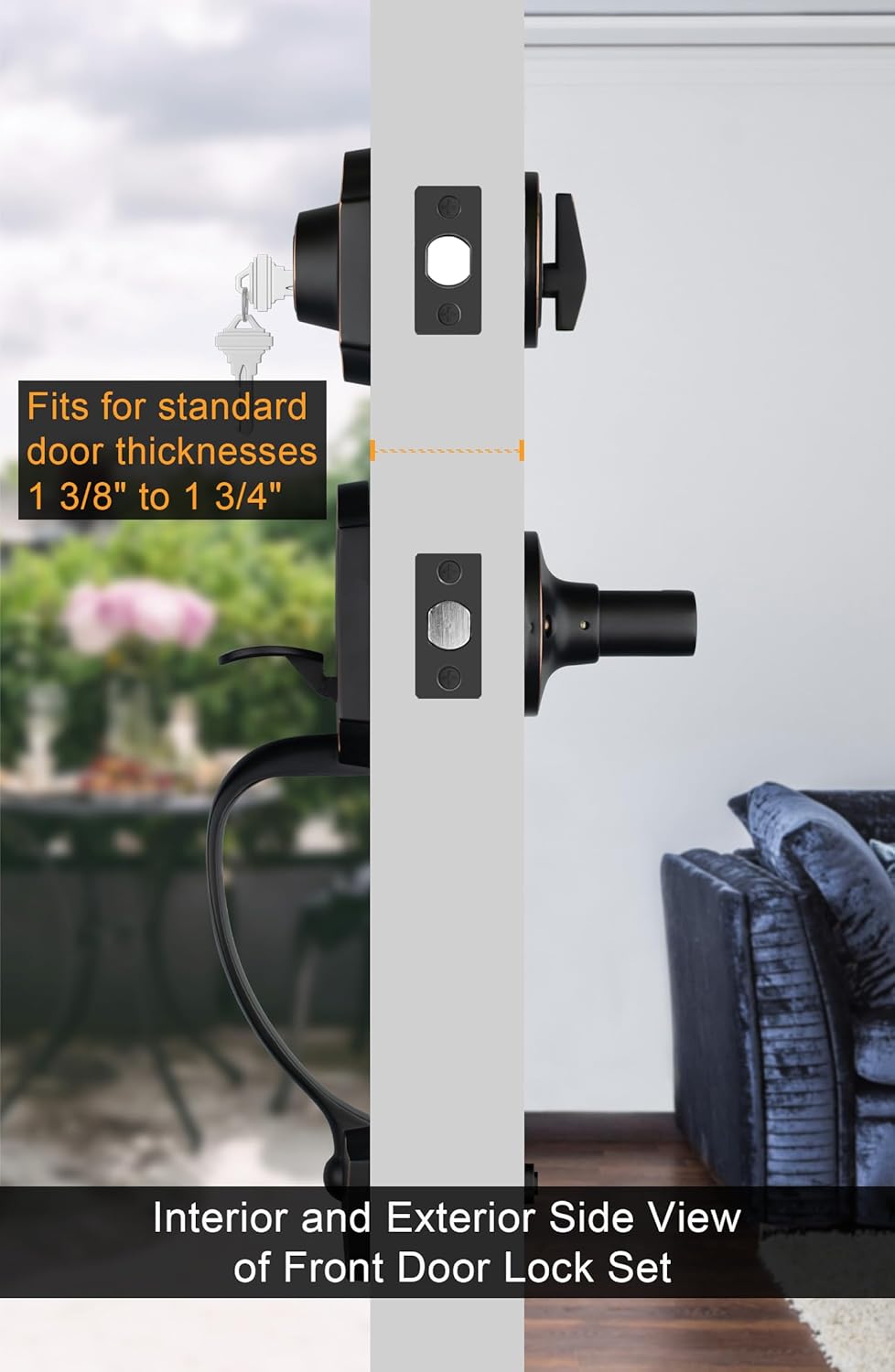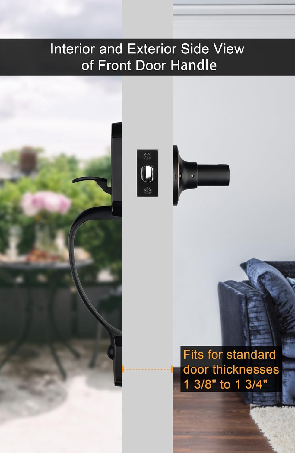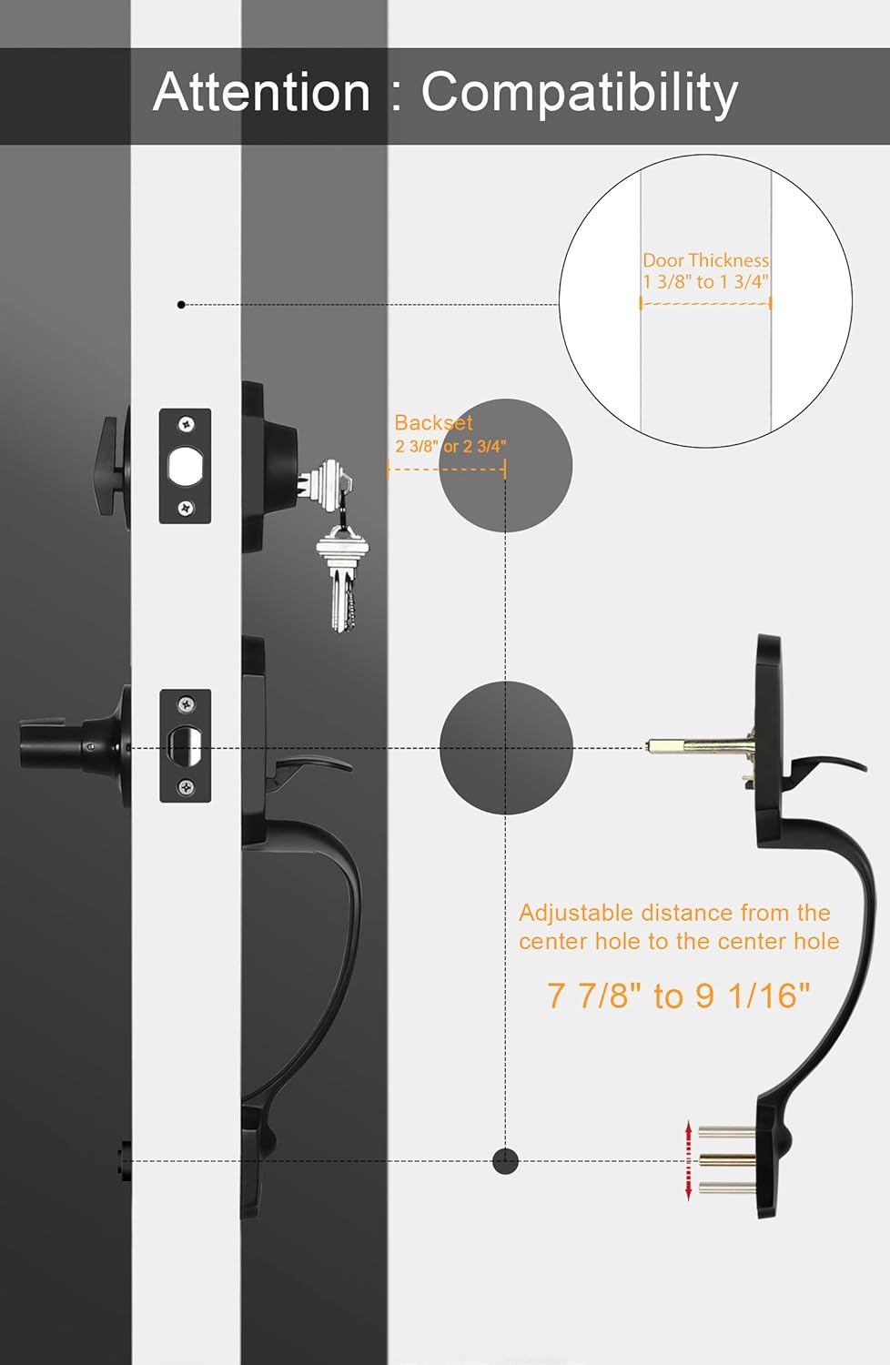 - 𝘼𝙙𝙟𝙪𝙨𝙩𝙖𝙗𝙡𝙚 𝙡𝙖𝙩𝙘𝙝 𝙖𝙣𝙙 𝙝𝙖𝙣𝙙𝙡𝙚𝙨𝙚𝙩 - Adjustable latch to fit 2 3/8" and 2 3/4" backsets. Fits on 1 3/8" to 1 3/4" thick doors. Adjustable distance from the center hole of the handle to the center hole is 7 7/8" to 9 1/16". Before you purhcase the exterior door handle sets, measure the thickness and backsets.