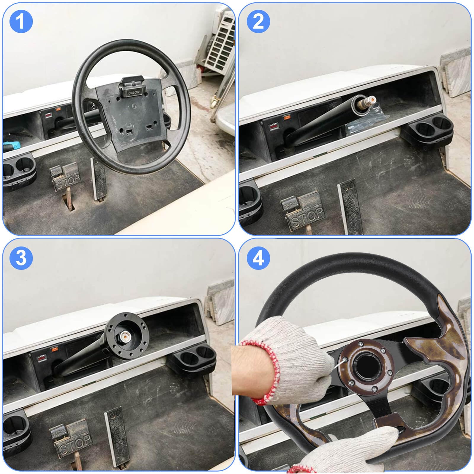 - Easy Installation: It is easy to install on EZGO, Club Car and Yamaha golf carts with custom steering wheel adapter (Attention: golf cart steering wheel adapter sold separately)