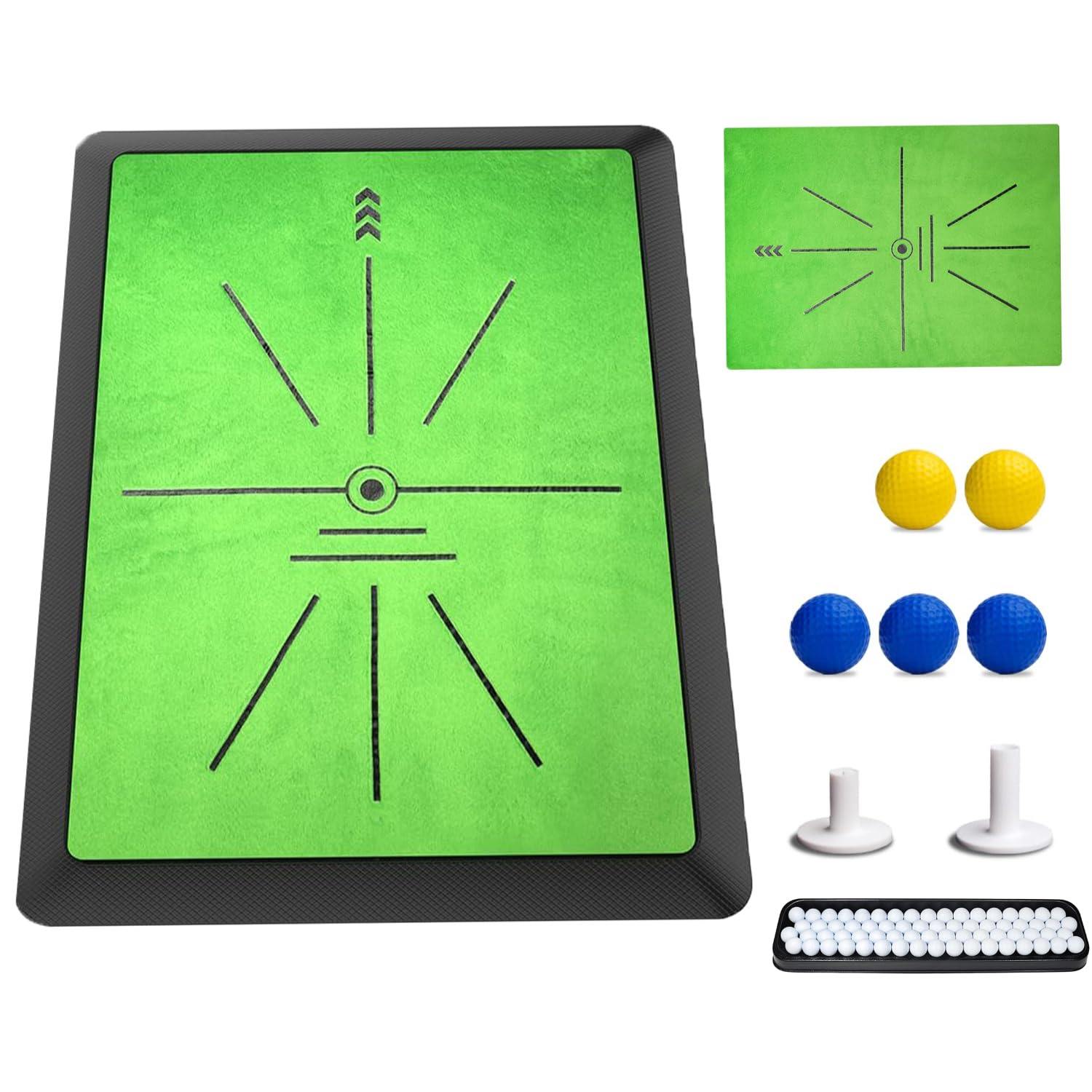 - Complete Golf Hitting Mat Kit: Complete golf chipping mat set includes a golf ball tray, 5 practice balls and 2 tees delivering convenience, value and all-in-one training for golfers of every skill level.