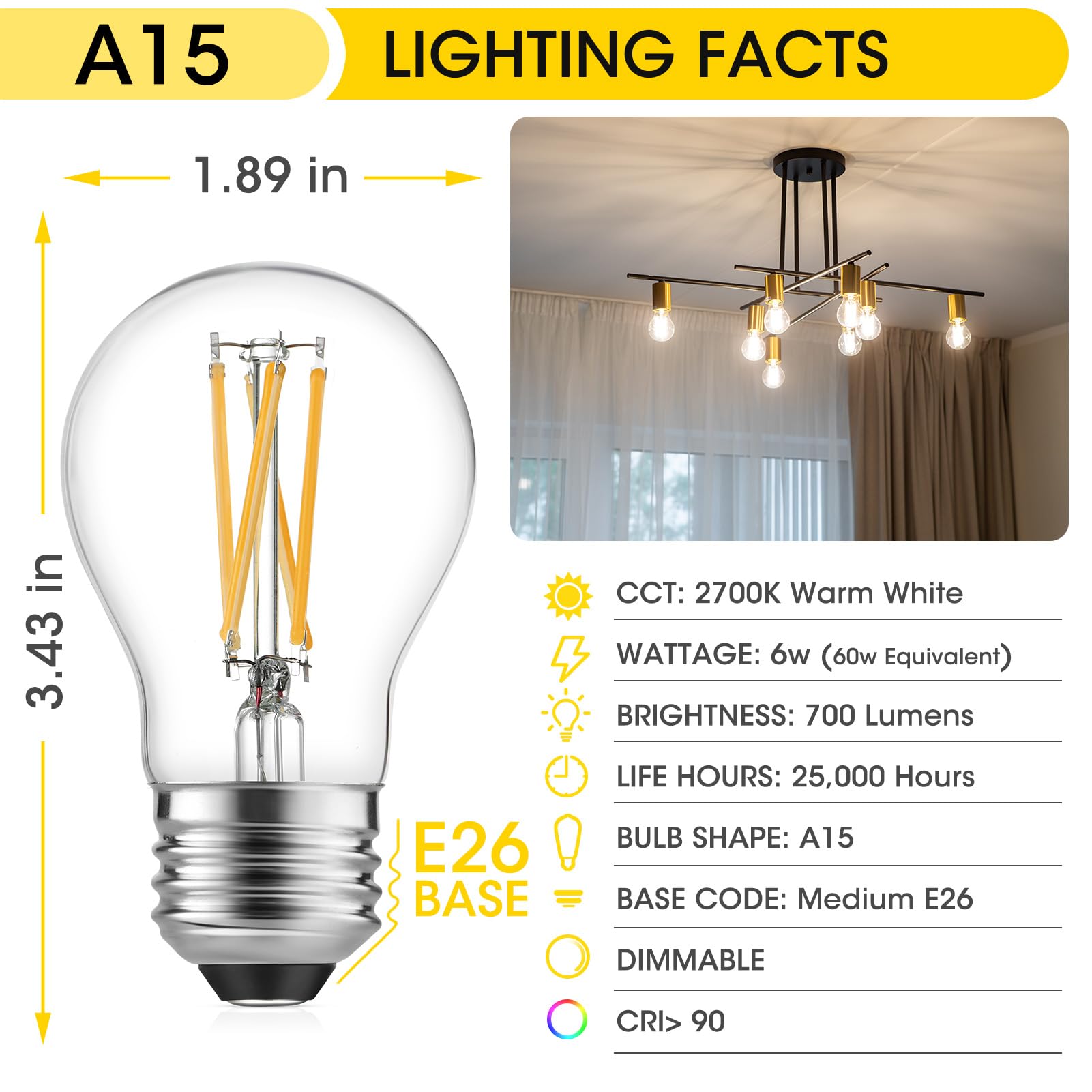 - Top Rated Dimmable A15 LED Edison Bulb with E26 Medium Base.