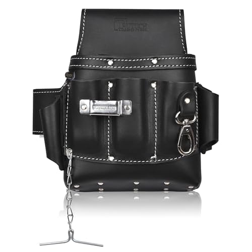 - Electrician Pouch leather has multiple Pockets, for every type of Tool. Features "T" Chain (Metal) Tape Clip for Electric Tape. Tunnel loop accommodates up to 3.6" wide Work Belt. Rust free Rivet reinforced for Durability.
