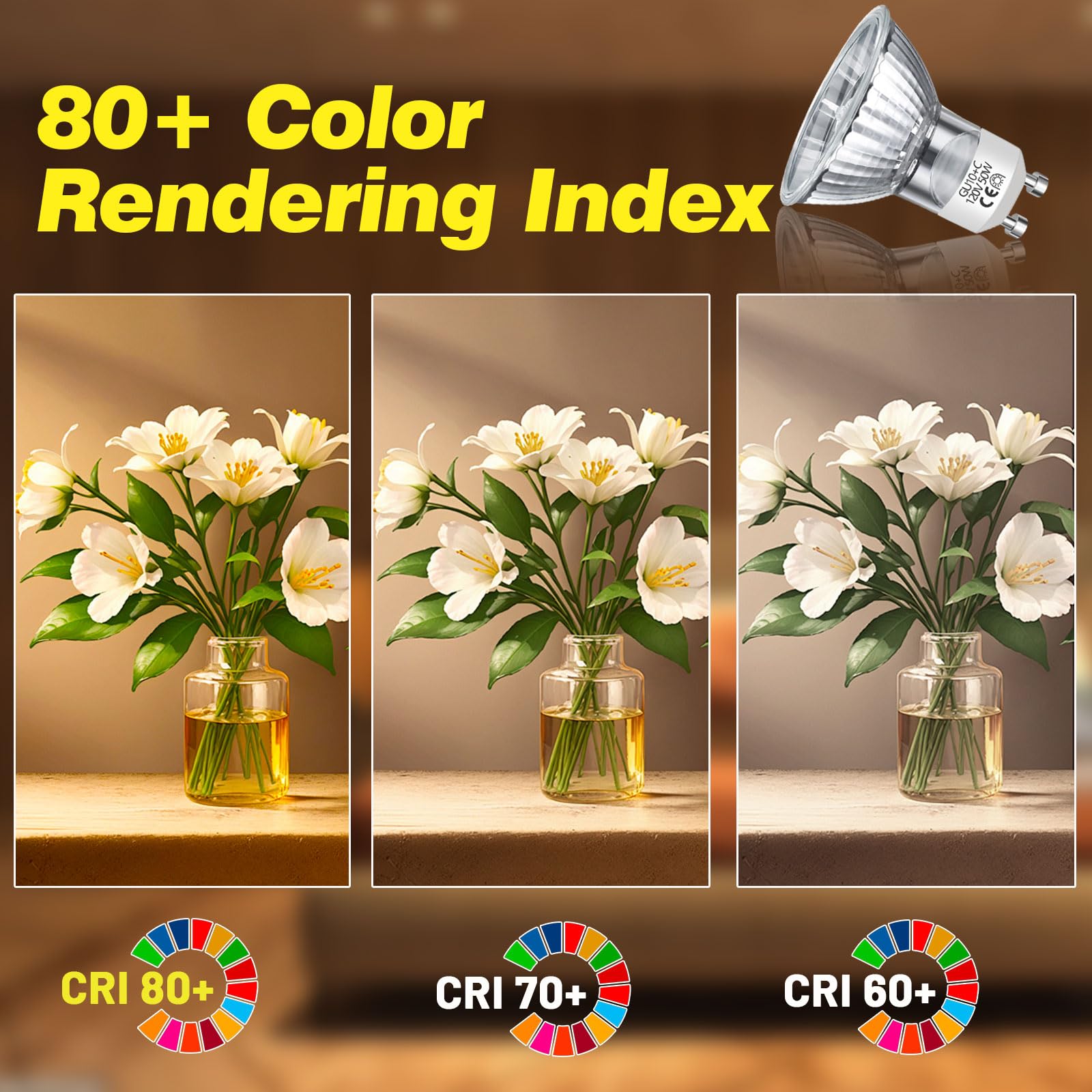 - 【Dimmable & Eye Protection】: Enjoy seamless brightness adjustment from 10% to 100% to match any mood or decor. Featuring no mercury or lead construction, ensuring zero flickering , these GU10 base halogen bulbs provide soft lighting to protect your family's visual health.