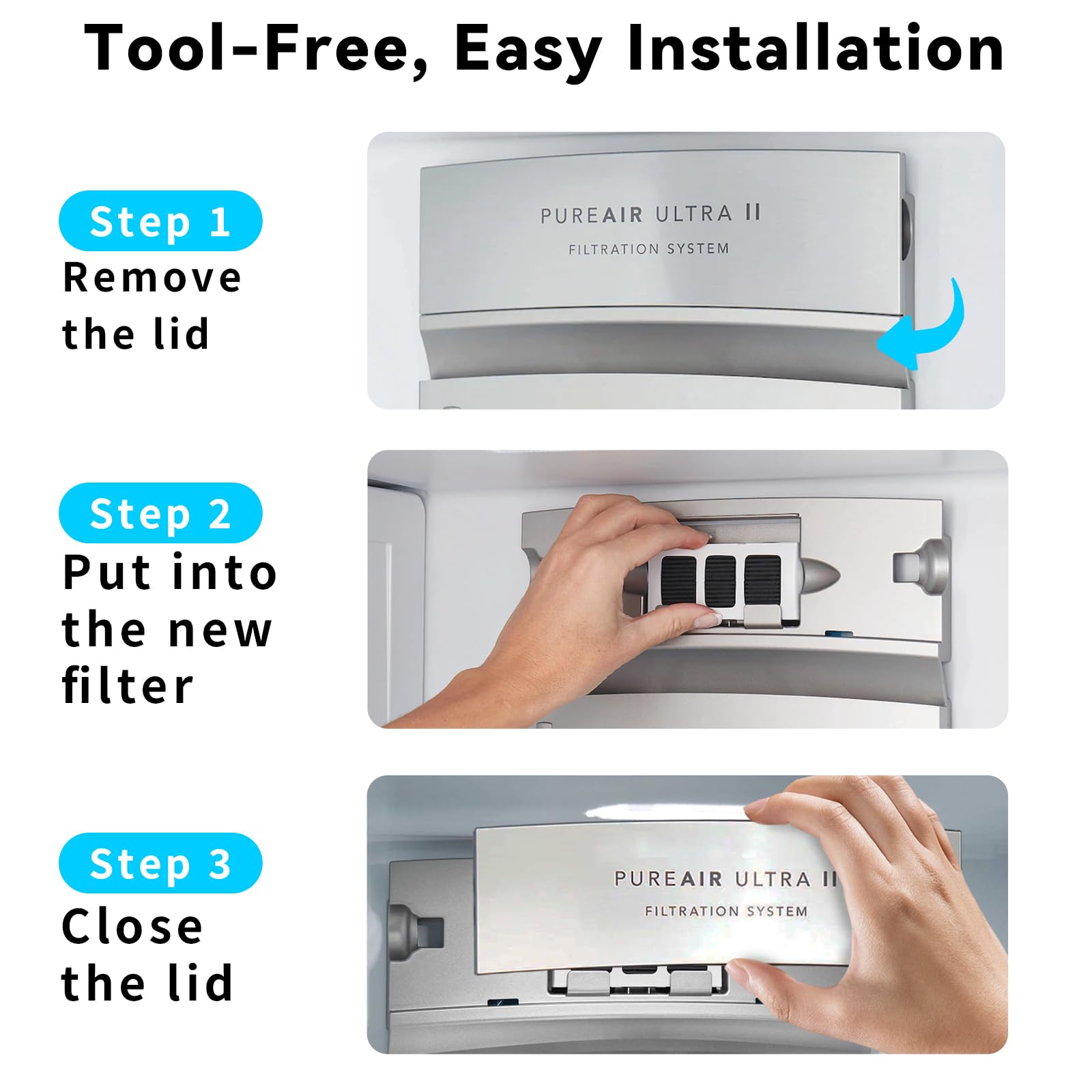 - Tool-Free Installation: just remove the old filter and install the filter into place. Perfect fit ensures optimal performance without hassle