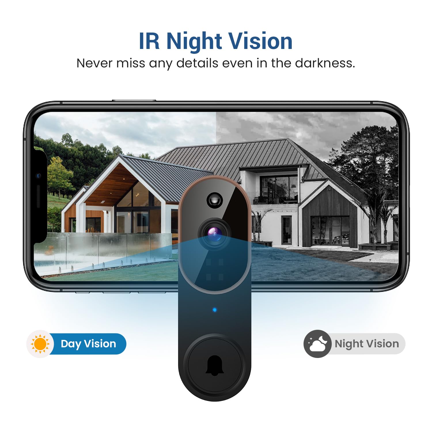 Details: Complimentary Doorbell Chime: Install the included chime in various locations like the kitchen, living room, or on the porch. Link one doorbell with several chimes indoors for added convenience. Bidirectional Audio Feature: Engage in real-time communication with visitors from anywhere, allowing instant interaction.